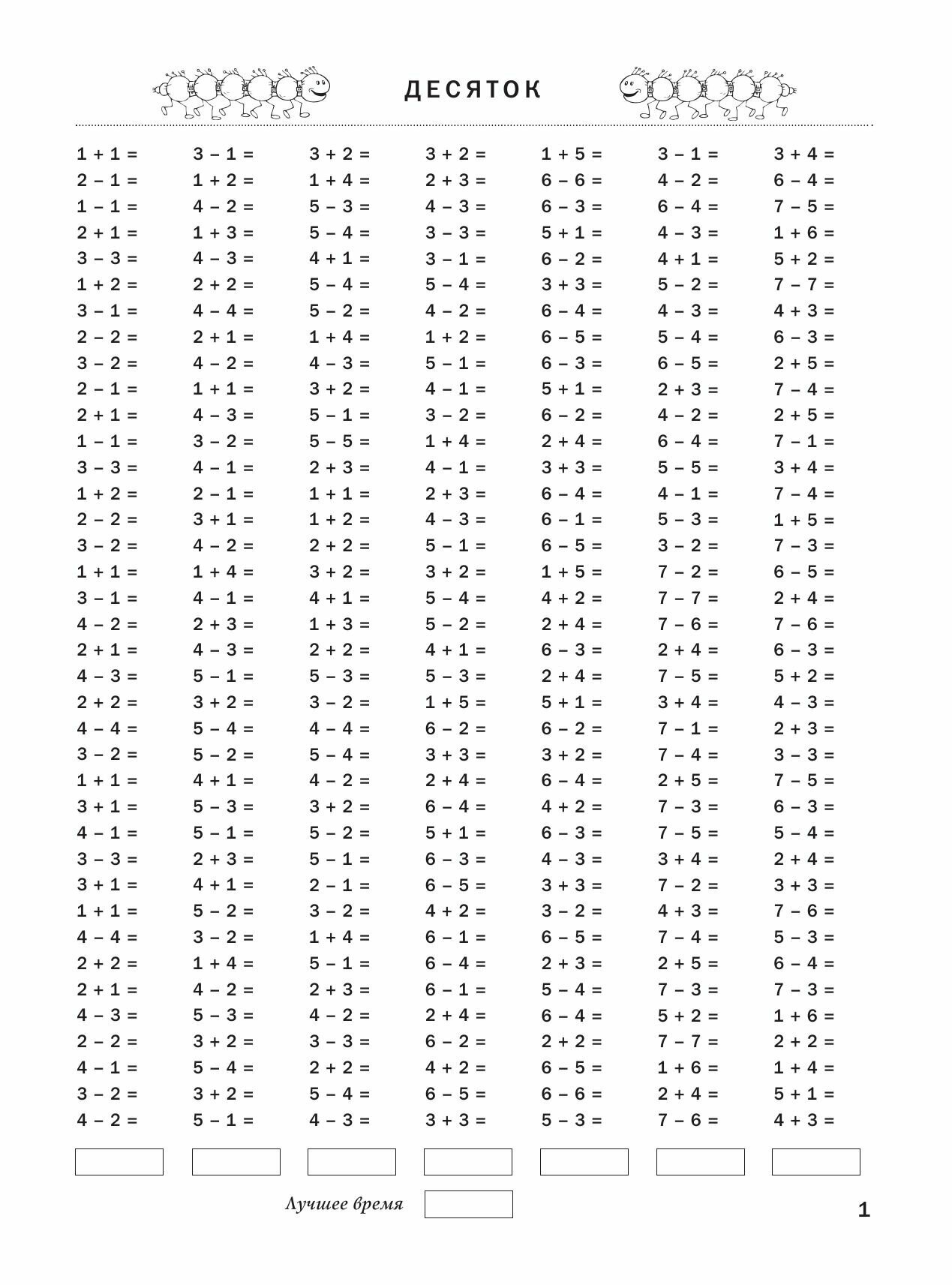 Лучшее пособие для автоматизации счета. Расчитана для первого класса, но мы используем ее с подготовительной группы. Записывая время каждый раз, ребенок видит свои результаты, и чем меньше времени он тратит, тем больше он доволен собой. Хороший стимул к развитию!