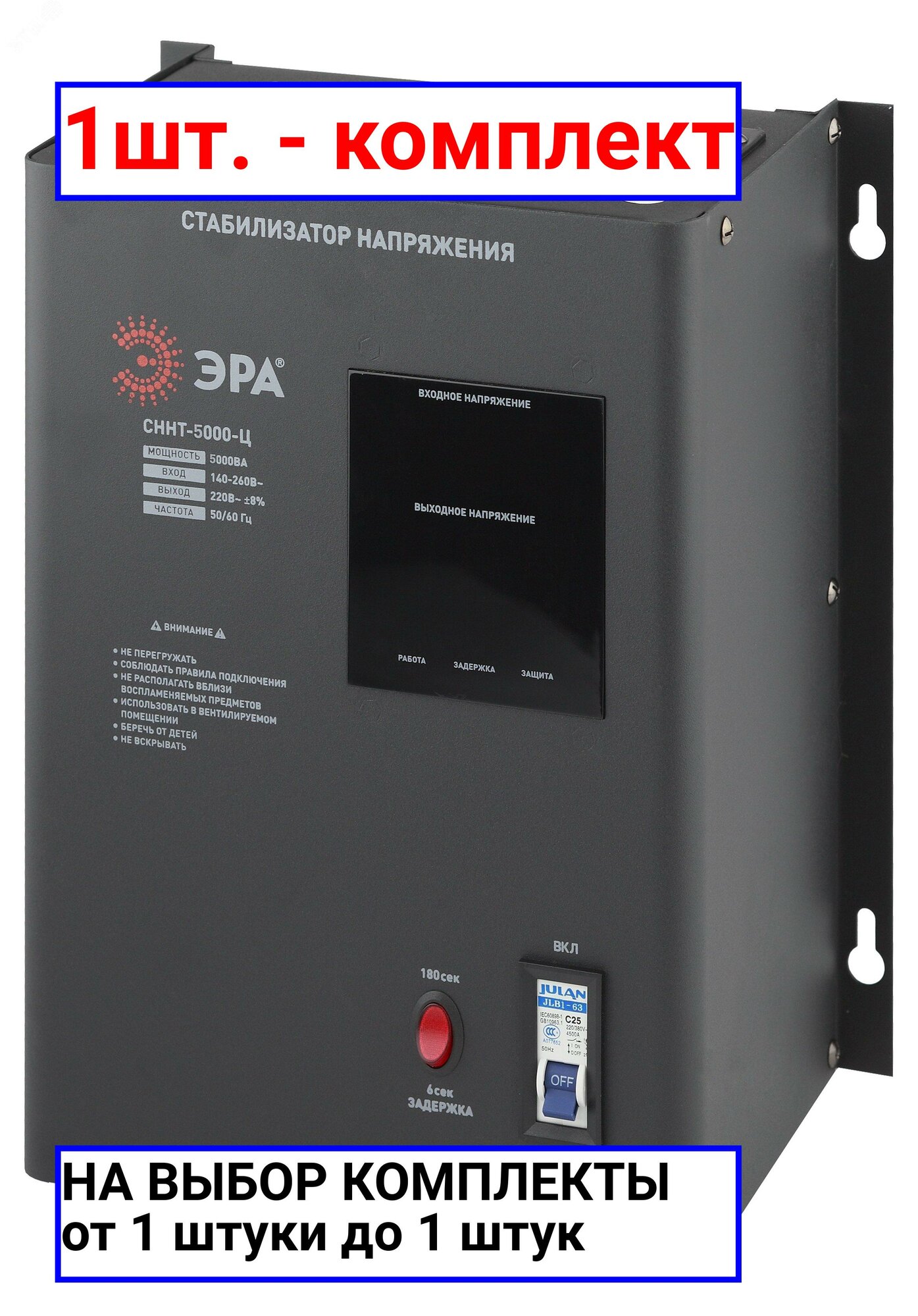 ЭРА СННТ-5000-Ц стабилизатор напряжения настенный с тороидальным трансформатором рассчитанный на нагрузку 5 кВт. Стабилизатор напряжения ЭРА СННТ-5000-Ц защитит ваши электроприборы от скачков напряжения, от короткого замыкания и продлит их срок службы работы. Прибор имеет малый вес, металлический корпус и оснащён настенным креплением. Степень защиты устройства IP20.