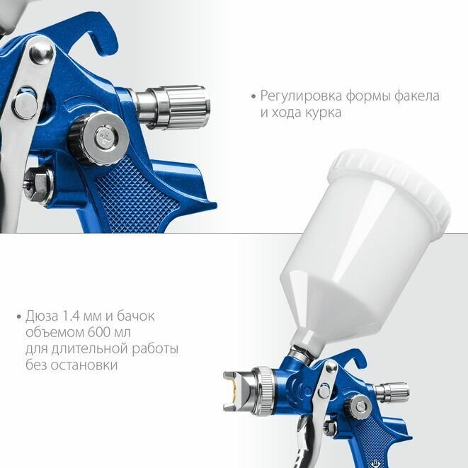 Краскопульт пневматический ЗУБР 06563-1.4, применяется в автосервисах, ремонтных мастерских и на специализированных предприятиях. Низкое выходное давление из пистолета и высокий расход воздуха позволяют получить высокий процент переноса ЛКМ на окрашиваемую поверхность (около 70%), равномерное распределение ЛКМ на поверхности, существенное сокращение объема аэрозольного тумана, высокая экологичность и снижение расхода ЛКМ до 30%. Дюза 1,4 мм является универсальной при использовании различных ЛКМ.