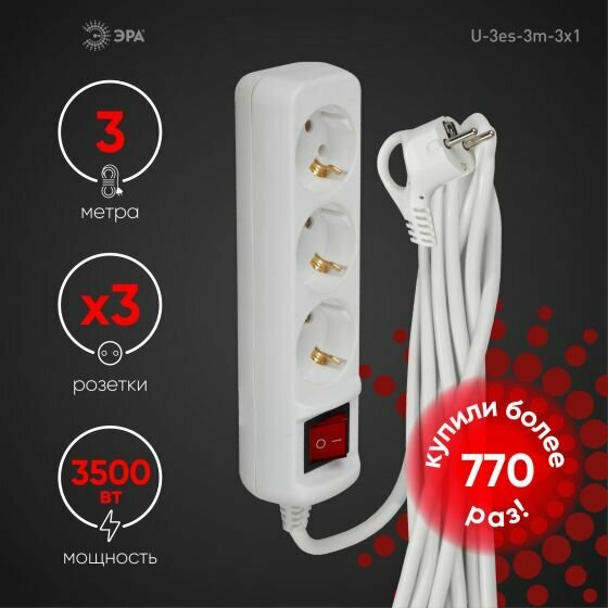 Удлинитель бытовой ЭРА. Серия U. Максимальная мощность 16 А/ 3500 Вт. С заземлением. Провод ПВС.