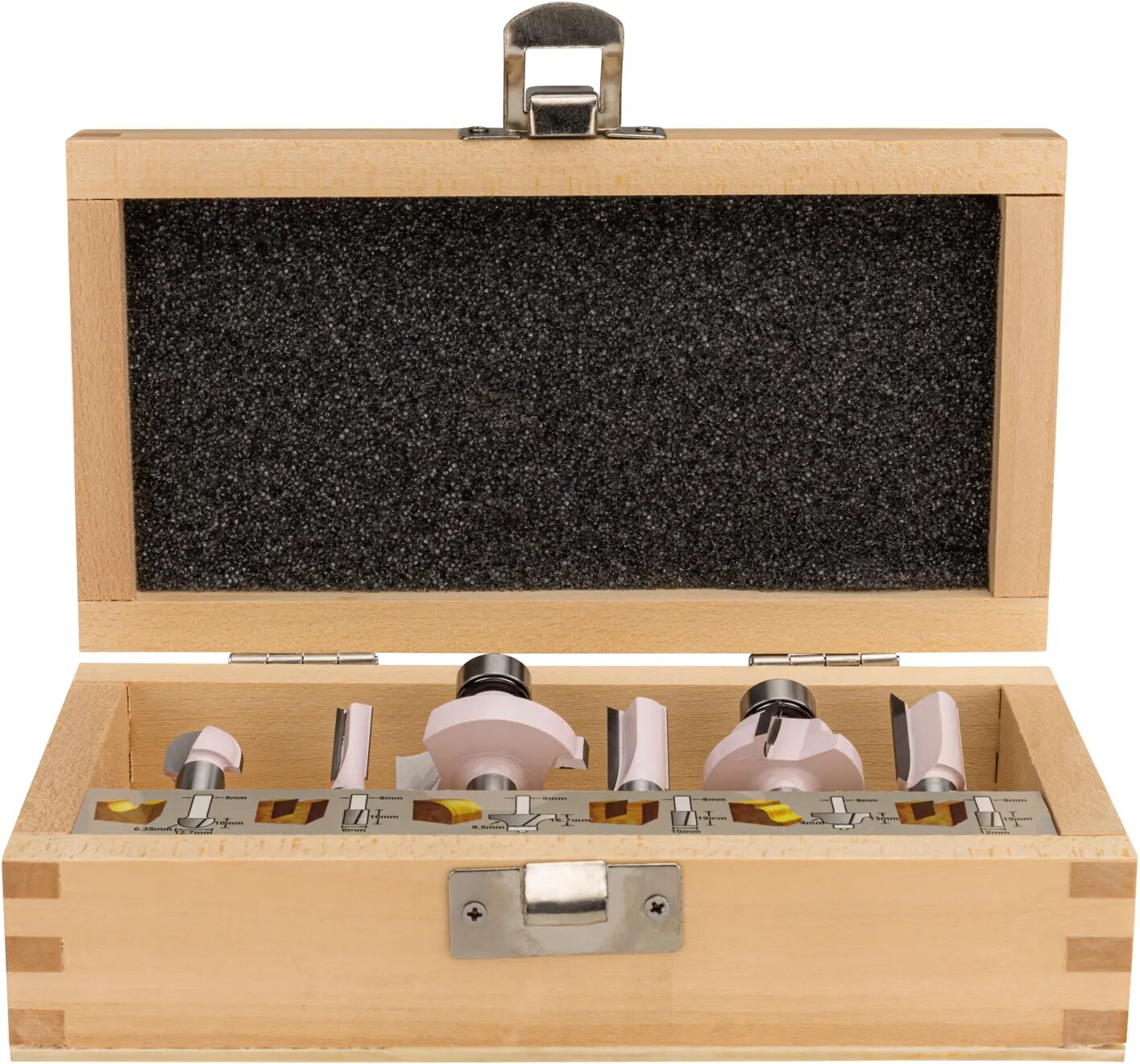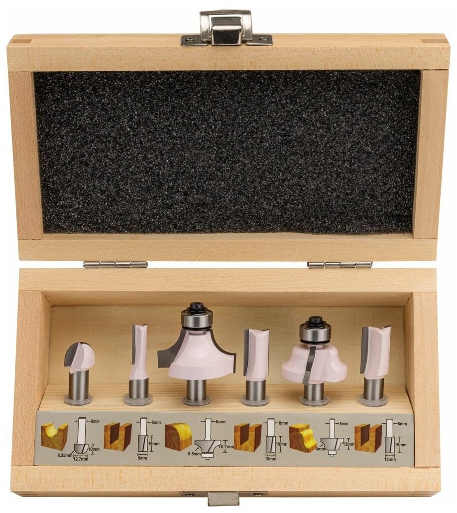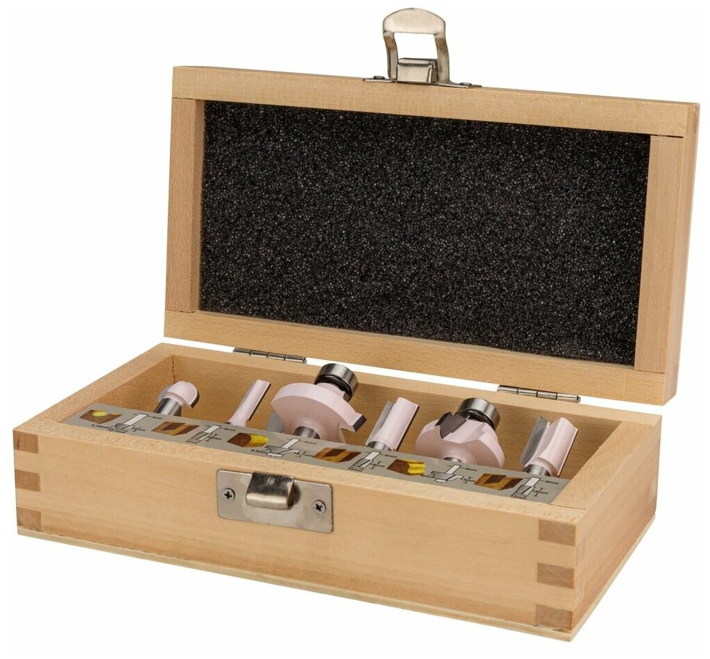 Набор используется в качестве оснастки при выполнении различных операций, например, при выемке пазов, обработке кромок. Идеально подходят для работы по мягкой и твердой древесине, плитам МДФ. Фрезы изготовлены из прочного металла, что обеспечивает стойкость к нагрузкам и долгий срок эксплуатации. Набор состоит из 6-ти фрез, деревянного кейса.