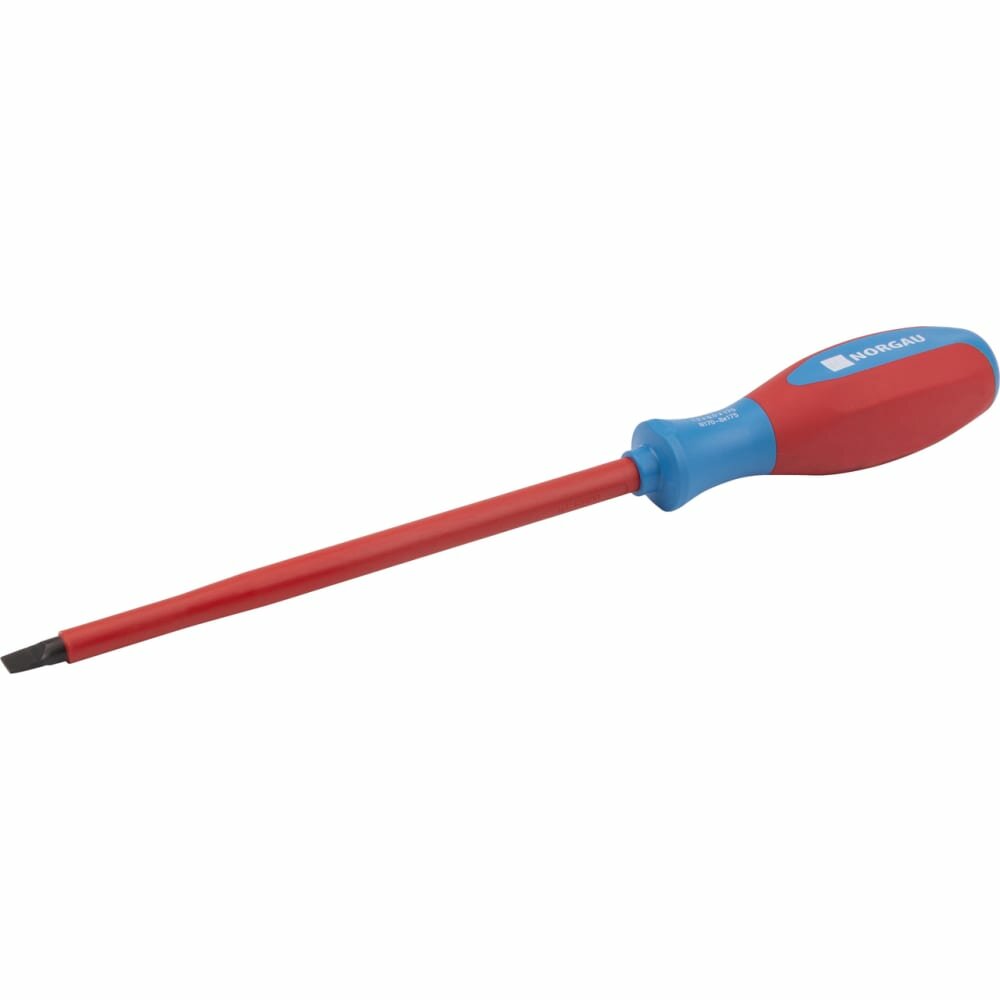 Профессиональная серия диэлектрического инструмента Norgau Industrial. Отвертка предназначена для безопасной работы с находящимися под напряжением деталями до 1000V. Тип шлица- прямой. Размер шлица- 8. Длина стержня- 175 мм. Толщина шлица- 1,2 мм. Полностью изолированный стержень из фосфатированной хром-ванадий-молибденовой стали. Максимально точное соответствие размерам крепежа, оптимальная площадь контакта. Двухкомпонентная рукоятка обеспечивает защиту от проскальзывания. Изготовлено по стандарту DIN ISO 2380 в соответствии с IEC 60900.