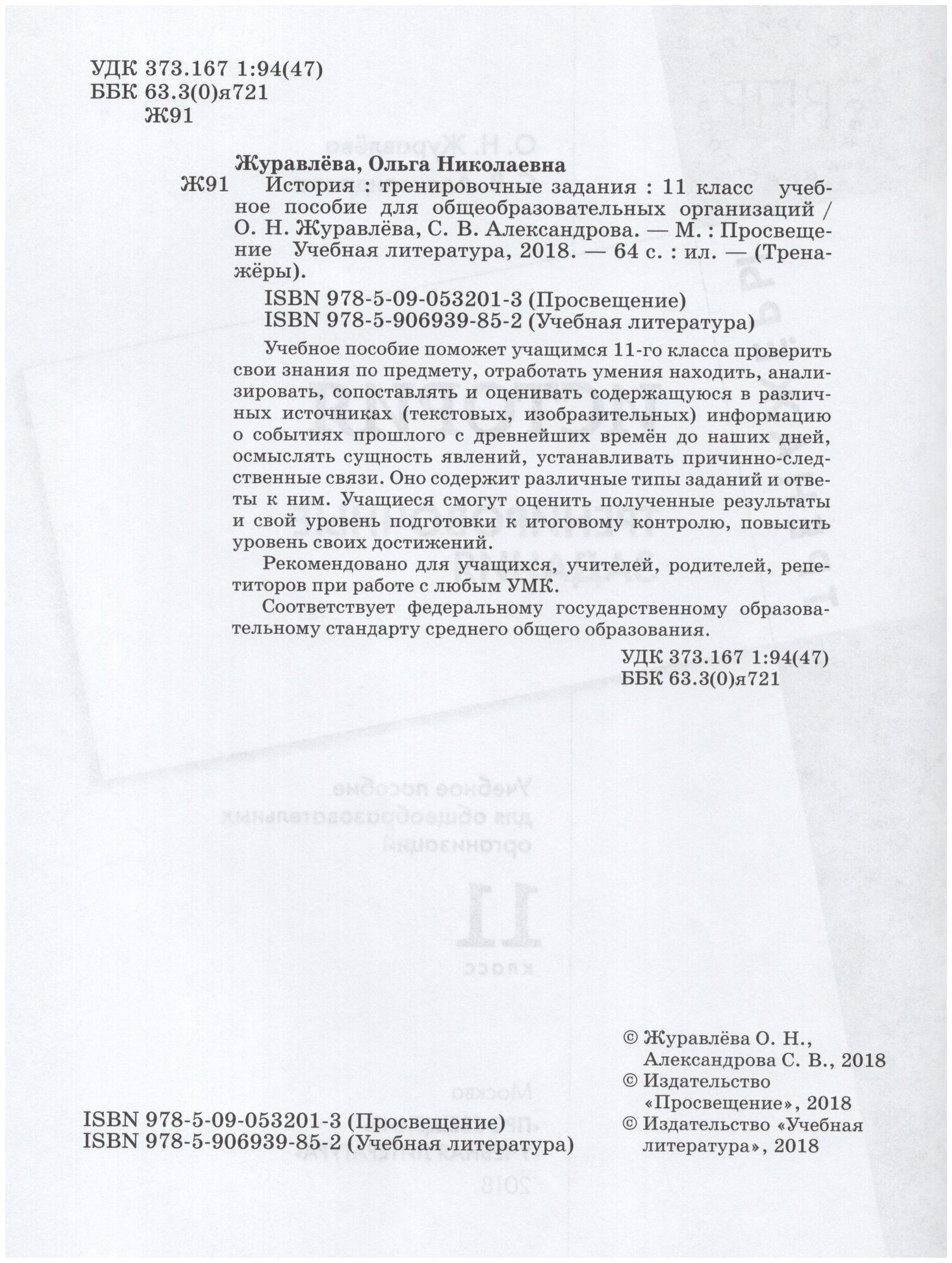 История. Тренировочные задания. 11 класс. Учебное пособие для общеобразовательных организаций (Журавлева Ольга Николаевна, Александрова Светлана Владимировна (соавтор)); Просвещение, 2018