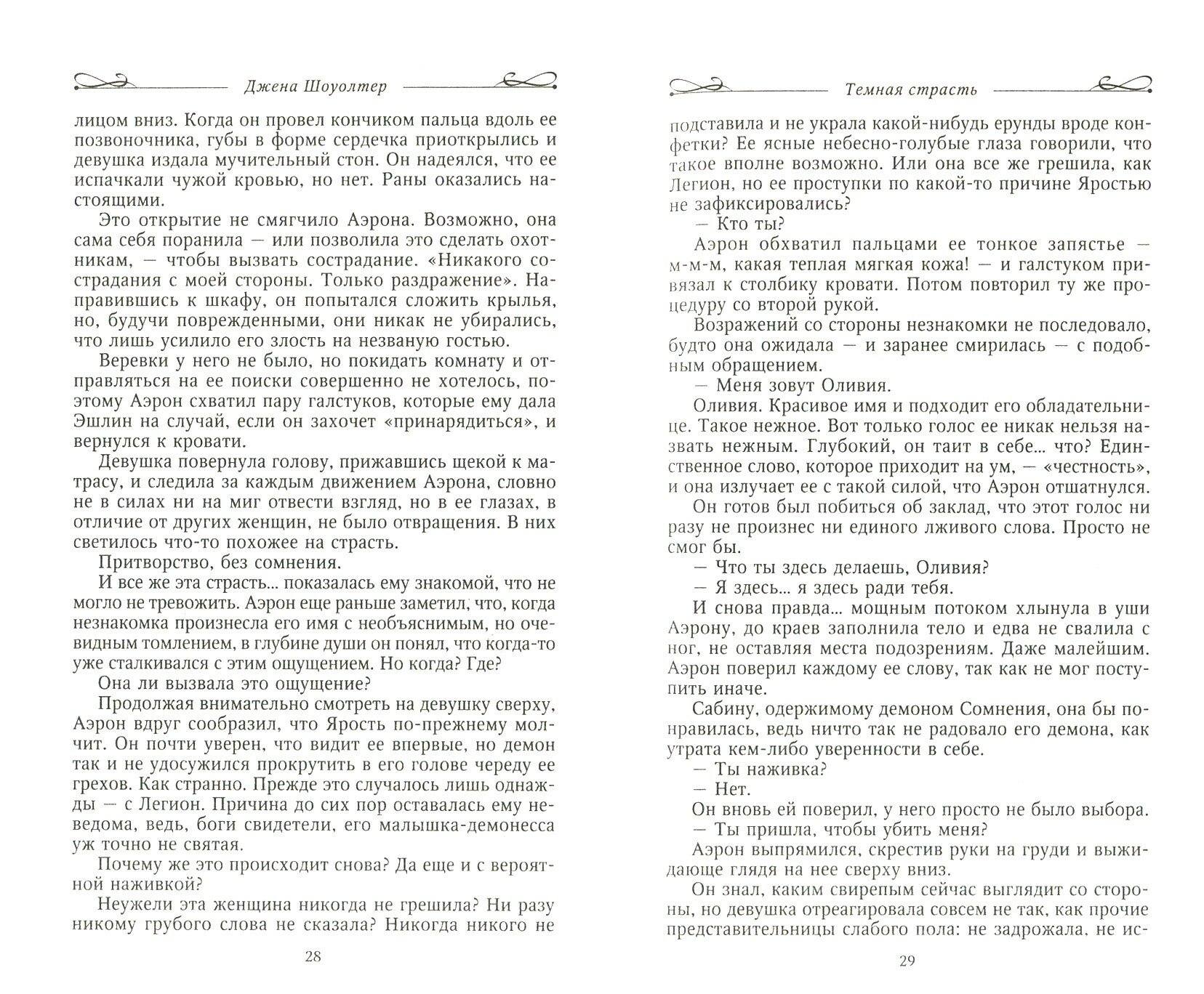 Эту книгу читаю пятой. Больше всего понравилась первая, про демона насилия и эшли. Дальше просто одно и потому, поведение всех демонов-гг практически абсолютно одинаковое – неприятие второй половинки. Ну, а в этой, в тёмной страсти, я устала на половине книги, столько всего намешано, а отношения главных героев просто надоедают – качели самые обыкновенные. В общем, 50 на 50. И интересно и бесит и надоело)