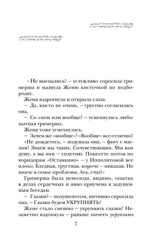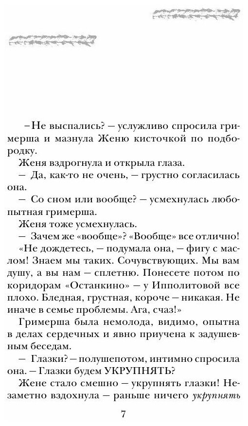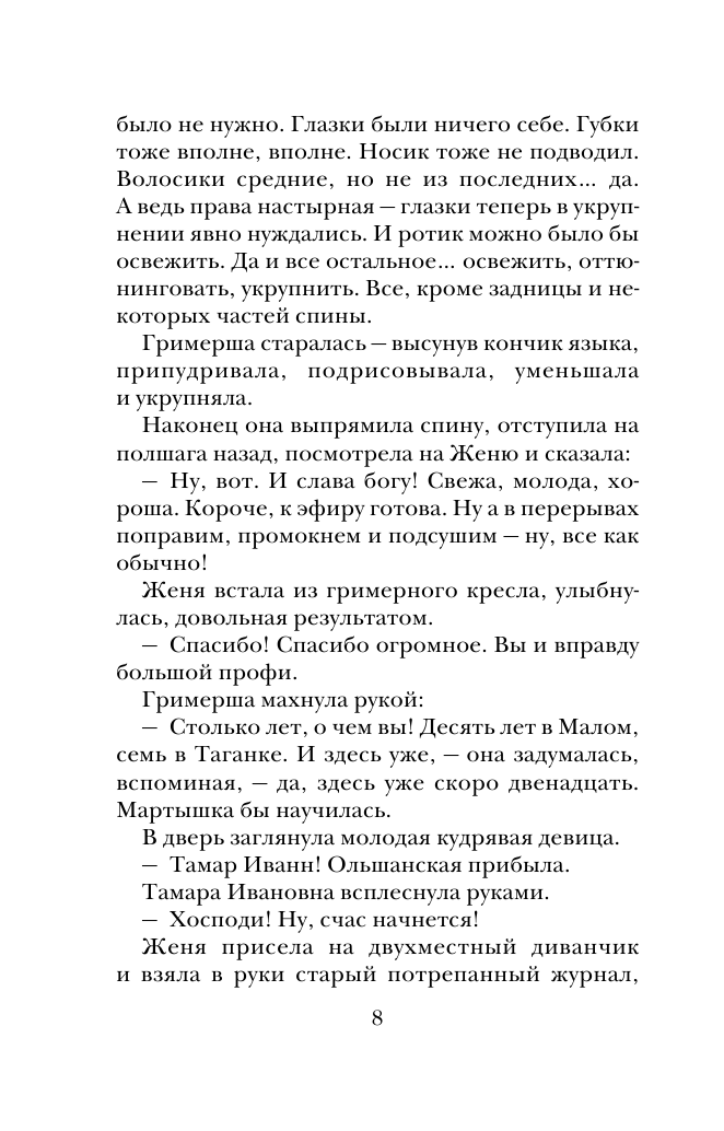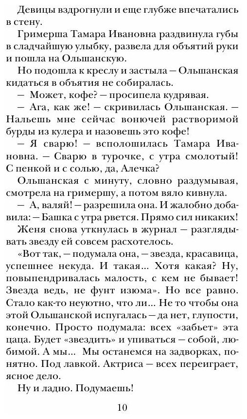 Это не первая мною прочитанная книга Метлицкой. До этого мне всё везло - попадались до такой степени интересные рассказы, что читались на одном дыхании. Но не в этот раз. Эту же книгу я мучаю который месяц, заставляю себя читать ее время от времени, но не идёт, и всё... В других ее произведениях всё такое жизненное, простое, что прям притягивает внимание, а здесь этого нет. Здесь вы найдёте один растянутый на 400 страниц рассказ, к тому же как-то нудно рассказанный, о съемках ток-шоу с тремя разными женщинами. В этом ток-шоу у них выпытывают различные грязные истории из их жизней, чтобы показать, кем они являются на самом деле, и это неприятно читать. Я очень разочарована. Не рекомендую!