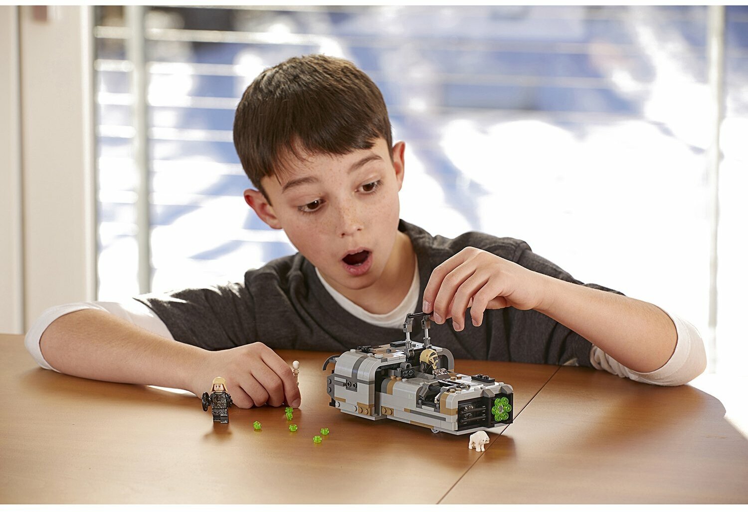 Из деталей набора вы сможете собрать великолепный спидер серого цвета с черными элементами. Составные части спидера детализированы и хорошо просматриваются: видны всевозможные механизмы и детали. Он оснащен открытой кабиной водителя с поднимающимися защитными креплениями, внутрь которой можно усадить минифигурку. Также есть отдельный отсек для перевозки двух хаундов. Спереди корпуса расположен шутер на 6 зарядов: он выстреливает небольшими зелёными снарядами при повороте круглой детали сбоку спидера. А сзади корпуса есть открывающийся отсек, в который можно поместить миску и косточки для кормления гончих.