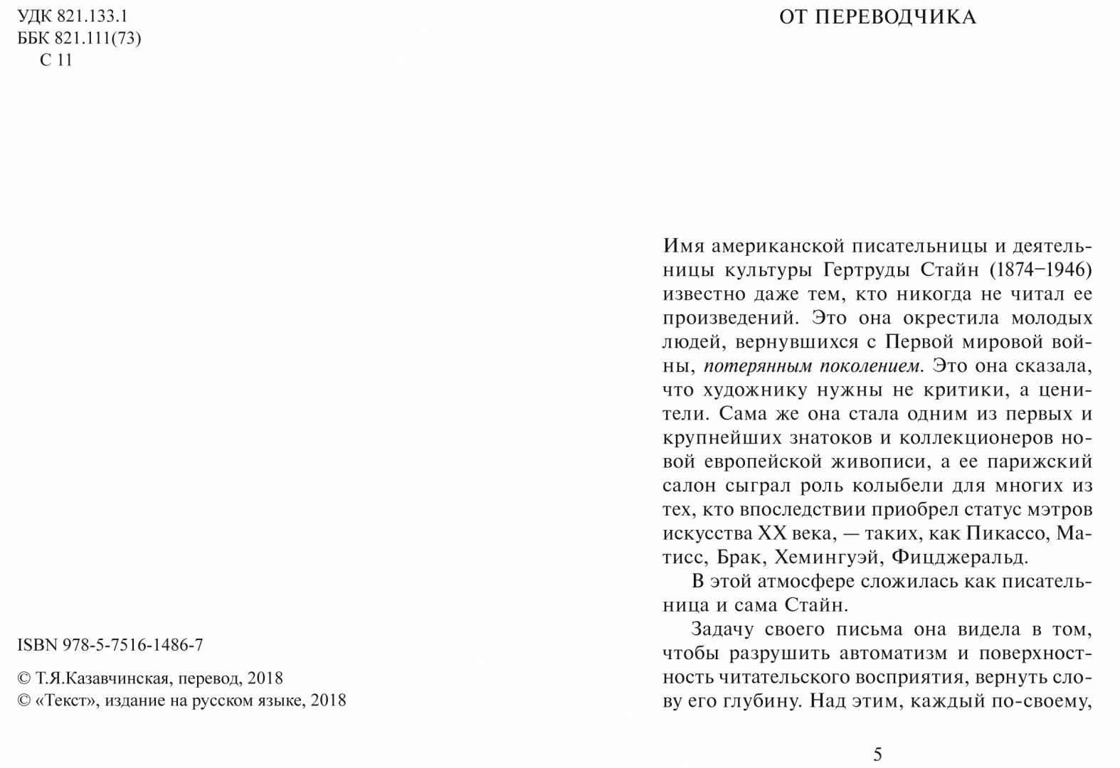 Имя американской писательницы Гертруды Стайн (1874-1946) известно даже тем, кто никогда не читал ее произведений. Это она окрестила молодых людей, вернувшихся с Первой мировой войны, потерянным поколением. Это она сказала, что художнику нужны не критики, а ценители. Задачу своего письма она видела в том, чтобы разрушить поверхностность читательского восприятия, вернуть слову его глубину. Над этим, каждый по-своему, бились и другие ее современники - писатели и теоретики искусства: Джойс, футуристы, ОПОЯЗовцы, обэриуты и многие другие. Но Стайн была одной из самых радикальных, и неслучайно она приобрела славу родоначальницы модернизма.