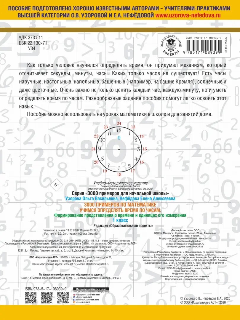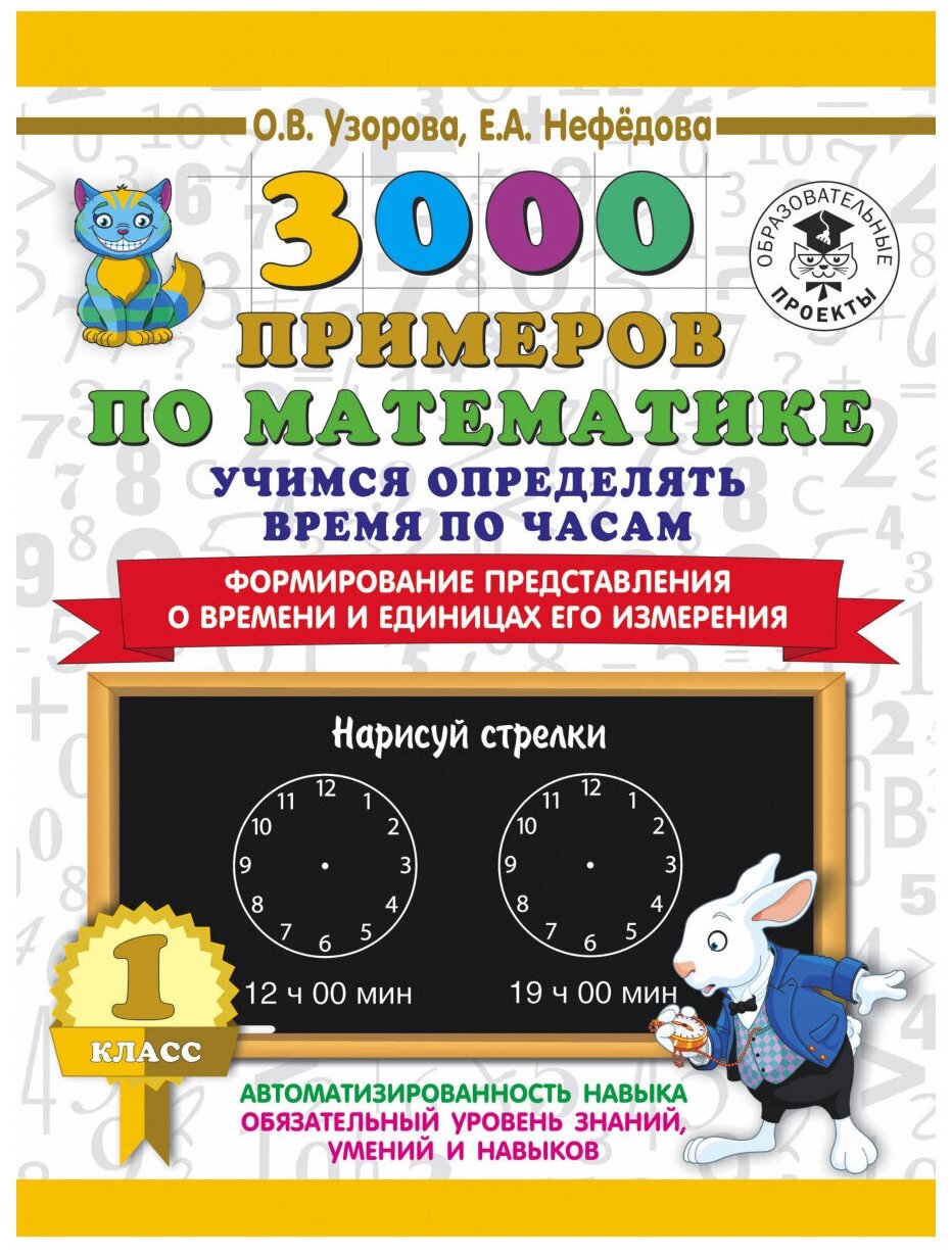 3000 примеров по математике. Учимся определять время по часам. 1 класс. Формирование представления о времени и единицах его измерения (Елена Алексеевна Нефедова, Ольга Васильевна Узорова); АСТ, 2021