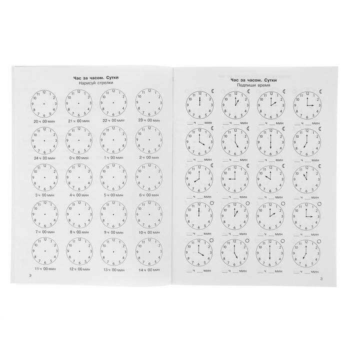Тоненькая книжка (16 листов) большого формата (А 4). Средней плотности бумага. На каждой странице 20 циферблатов. Заданий всего 2: нарисуй стрелки (к указанному времени) или подпиши правильное время. Это задания для ребёнка, который только осваивает часы. Всё время получается, что сколько-то часов и 00 минут. Мне показалось, что это для дошкольников. Или для первоклассника, совсем не знающего часики. Если первоклашка продвинутый, ему будет скучно. Лучше, наверное, купить все четыре класса. Можно будет постепенно от простого к сложному идти. А если вдруг ребёнку надоест одно и тоже делать, предложить ему следующий уровень - с минутами и даже секундами. Единственный непонятный для меня момент - это "луна" и "солнышко". Надо было не "день-ночь" писать, а как в школе " до полудня и после полудня". В остальном очень хорошая серия. Я давно искала что-то подобное. Полное соответствие цены и качества. Рекомендую всем, у кого ребёнку надо "набить руку" в определении времени по часикам со стрелочками.