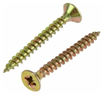 Длина самореза составляет 50 мм, диаметр — 4 мм. Головка потайная, при закручивании полностью утапливается в поверхность, что упрощает дальнейшую отделку.