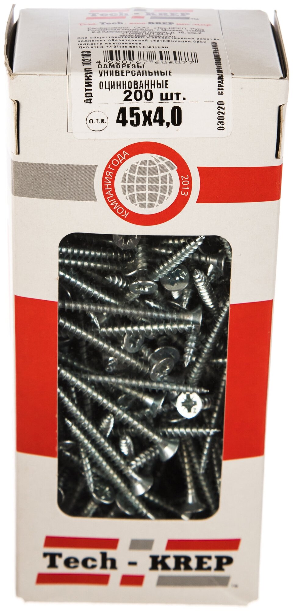 Универсальный саморез Tech-Krep 45х4,0 мм 200 шт оцинкованный, коробка с окном изготовлен из углеродистой стали с антикоррозионным цинковым покрытием, имеет потайную головку с крестообразным шлицем PZ, крупную накатанную резьбу и острый наконечник.Применяется для крепления дерева, любых видов древесных плит, листового металла небольшой толщины, гипсокартона и прочих листовых материалов с прочной фиксацией к любым поверхностям с использованием пластиковых дюбелей.