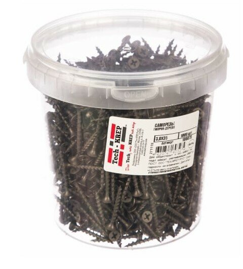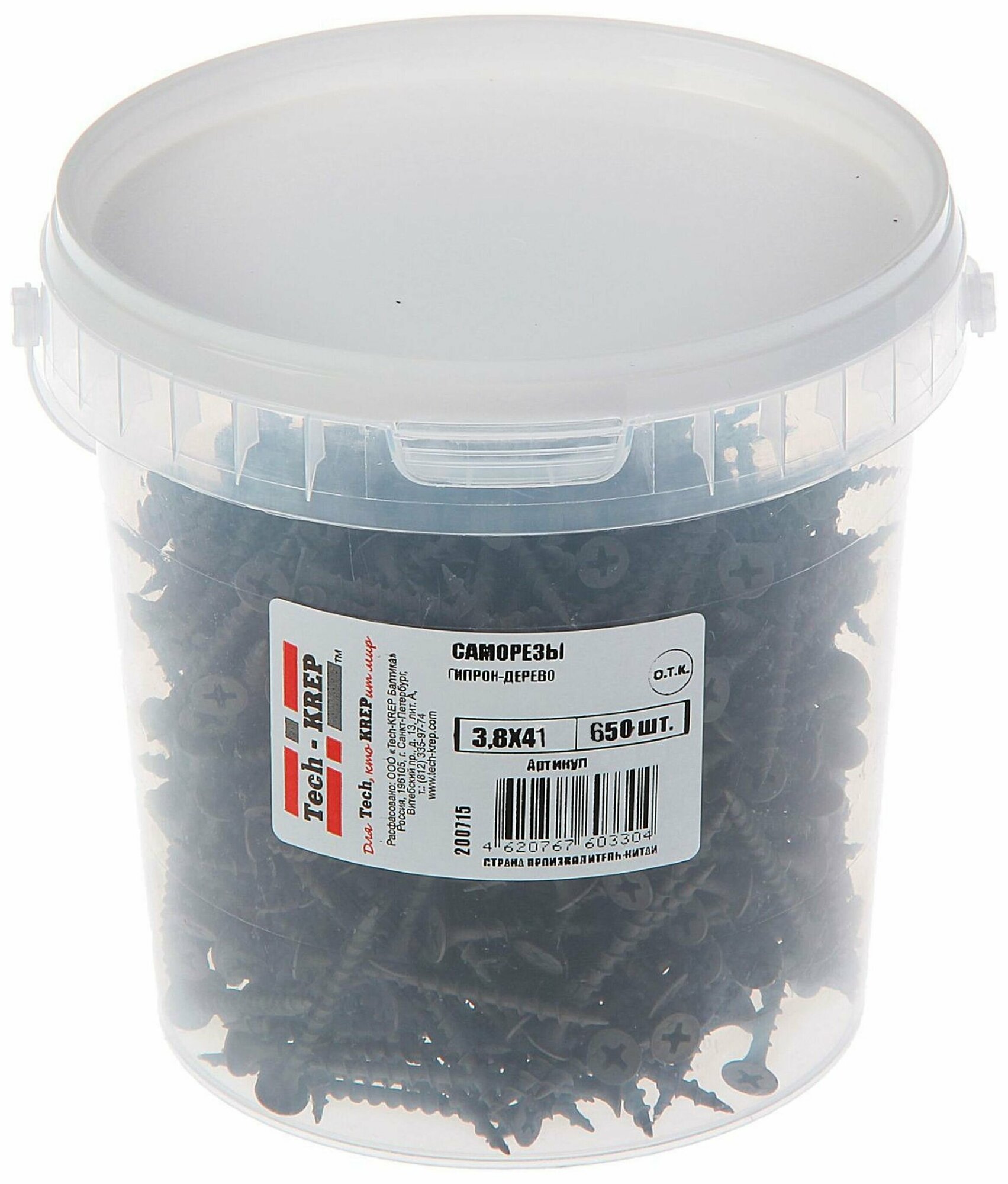 Саморезы гипсокартон-дерево, 3,8 х 41 мм, 650 штСаморезы 3.8х41 Tech-Krep 100080 предназначены для соединения частей из дерева и гипсокартона. Этот вид крепежа незаменим при монтаже подвесных потолков, обшивке стен ГК-листами. Изделие также монтируется в основание из ДСП, фанеры, пластмассы, используется в изготовлении мебели.Саморезы гипсокартон-дерево ГД - универсальный крепеж. Строения, конструкции из дерева применяются издревле и до нынешних времен выработан крепеж, в наибольшей степени отвечающий особенностям крепления. Черные саморезы - конструктивные особенности саморезов ГД. острый наконечник. крупная резьба или по-другому редкий шаг. потайная голова. Острый наконечник позволяет монтировать метиз без предварительного сверления.