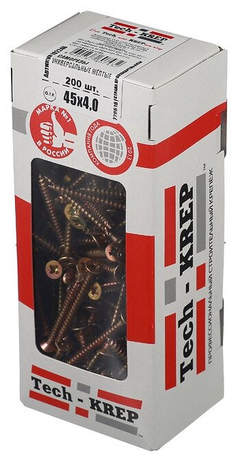 **Саморез универсальный Tech-Krep** предназначен для общестроительных и ремонтных работ — от навешивания полок в квартире до сборки металлоконструкций. Может применяться с любым материалом. С мягкими элементами (из пластмассы, дерева) вкручивается без засверливания, с твердыми (из металла) — требуется предварительное сверление.