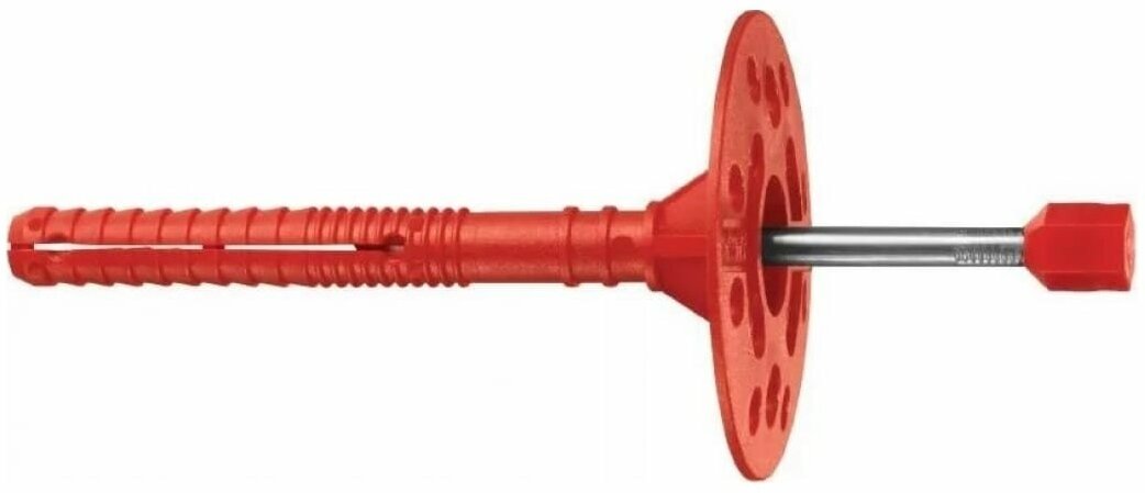 Применяется для крепления теплоизоляционных материалов к бетону, полнотелому и пустотелому кирпичу, камню, пенобетону. Представлен в виде дюбеля с двухсегментной распорной частью из ударопрочного полипропилена с увеличенной прижимной шайбой диаметром 60 мм и металлическим оцинкованным гвоздем с потайной головкой. Используется при монтаже тяжелых видов утеплителя или утеплителя (толщиной до 240 мм). Шляпка дюбеля способствует надежному удержанию материала теплоизоляции, препятствуя прорыву в месте крепления. Установка производится методом сквозного монтажа. В среднем на 1 кв. м. теплоизоляции требуется 5-6 дюбелей.