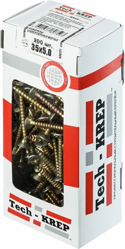 Саморез универсальный Tech-KREP 5x35 мм желтый потайная головка PZ2, 200 шт, 0.58 кг – самонарезающий шуруп в виде стержня с наружной резьбой, головкой и острым наконечником. При его установке не требуется дополнительно подготовленное отверстие. Слой цинка придает поверхности желтоватый оттенок. Крепежное изделие изготовлено из износостойкой и прочной стали. Покрытие защищает крепеж от воздействия влажной среды. Отличительные особенности: материал устойчив к влаге, механическим воздействиям, перепадам температур; без предварительного сверления; шлиц надежно фиксирует инструмент; длительный срок эксплуатации. Основное применение Желтопассированные саморезы используются для крепления разных элементов конструкций к пластмассовым, деревянным основаниям.