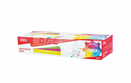 Линейка Deli Pioneer пластик длина 30см ассорти флуорисцентный градуировка УФ чернила европодвес, в упаковке 30шт.Две шкалы: 20 см/8 дюймов.Ширина: 3 см.Точное измерение благодаря качественной разметке шкалы.УФ нанесение защищает разметку шкалы от стирания.Удобно брать со стола.Материал: прочный полистирол.Соответствует требованиям безопасности и стандартам качества продукции.Для детей старше 3-х лет.