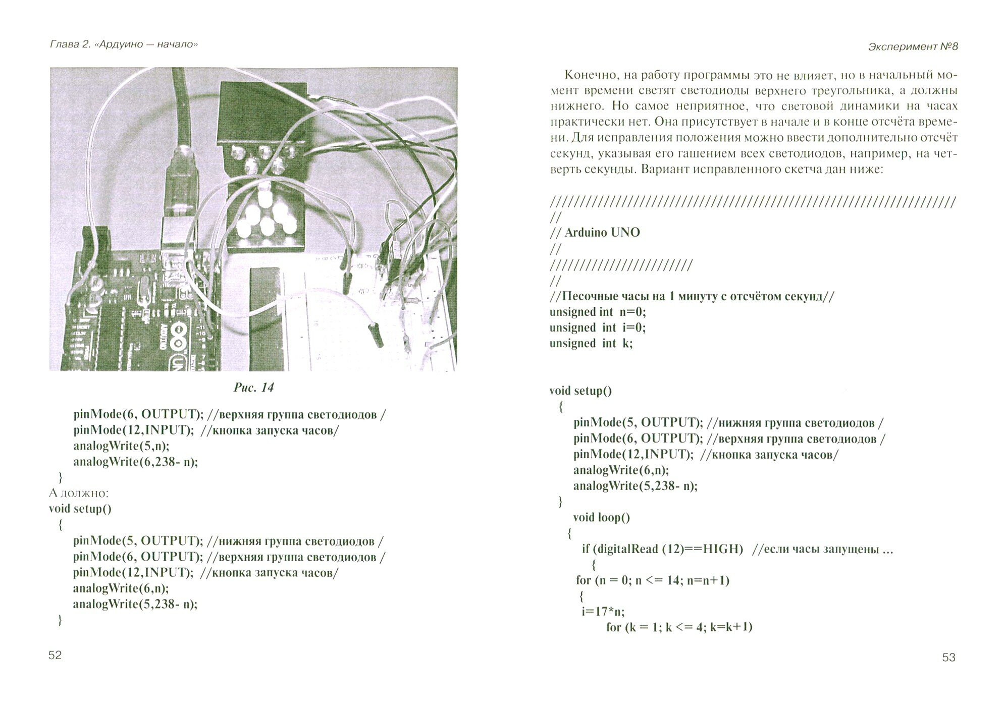Книга содержит шесть глав, первые пять рассказывают об экспериментах с платой Arduino UNO. Шестая глава содержит описания законченных конструкций.