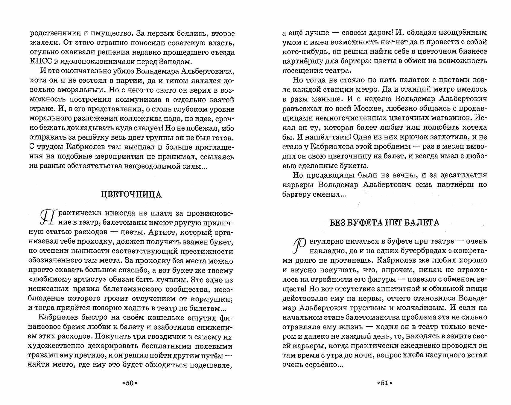 В книге содержится сто двадцать три байки, которые записаны со слов призрака Кабриолева. Все они про балет и около него, в той или иной степени, но вот имён Вольдемар Альбертович никогда не называет, хотя про многих и так понятно. Хронология отсутствует, но мелькают привязки к конкретным событиям. И всё привязано к одному конкретному месту, где сейчас призрак балетомана и обитает - к Большому театру.