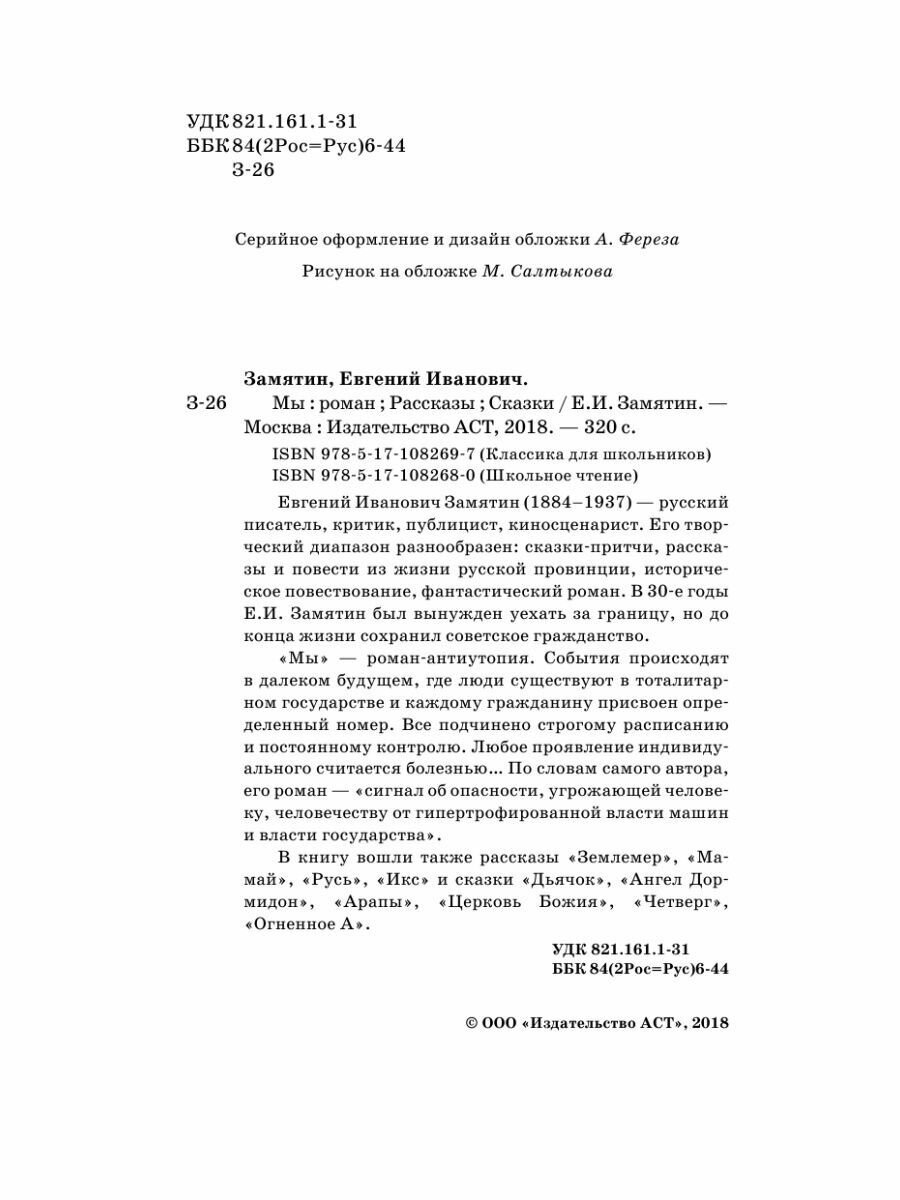 Евгений Иванович Замятин (1884-1937) - русский писатель, критик, публицист, киносценарист. Его творческий диапазон разнообразен: сказки-притчи, рассказы и повести из жизни русской провинции, историческое повествование, фантастический роман. В 30-е годы Е. И. Замятин был вынужден уехать за границу, но до конца жизни сохранил советское гражданство. "Мы" - роман-антиутопия. События происходят в далеком будущем, где люди существуют в тоталитарном государстве и каждому гражданину присвоен определенный номер. Все подчинено строгому расписанию и постоянному контролю. Любое проявление индивидуального считается болезнью. По словам самого автора, его роман - "сигнал об опасности, угрожающей человеку, человечеству от гипертрофированной власти машин и власти государства". В книгу вошли также рассказы "Землемер", "Мамай", "Русь", "Икс" и сказки "Дьячок", "Ангел Дормидон", "Арапы", "Церковь Божия", "Четверг", "Огненное А".