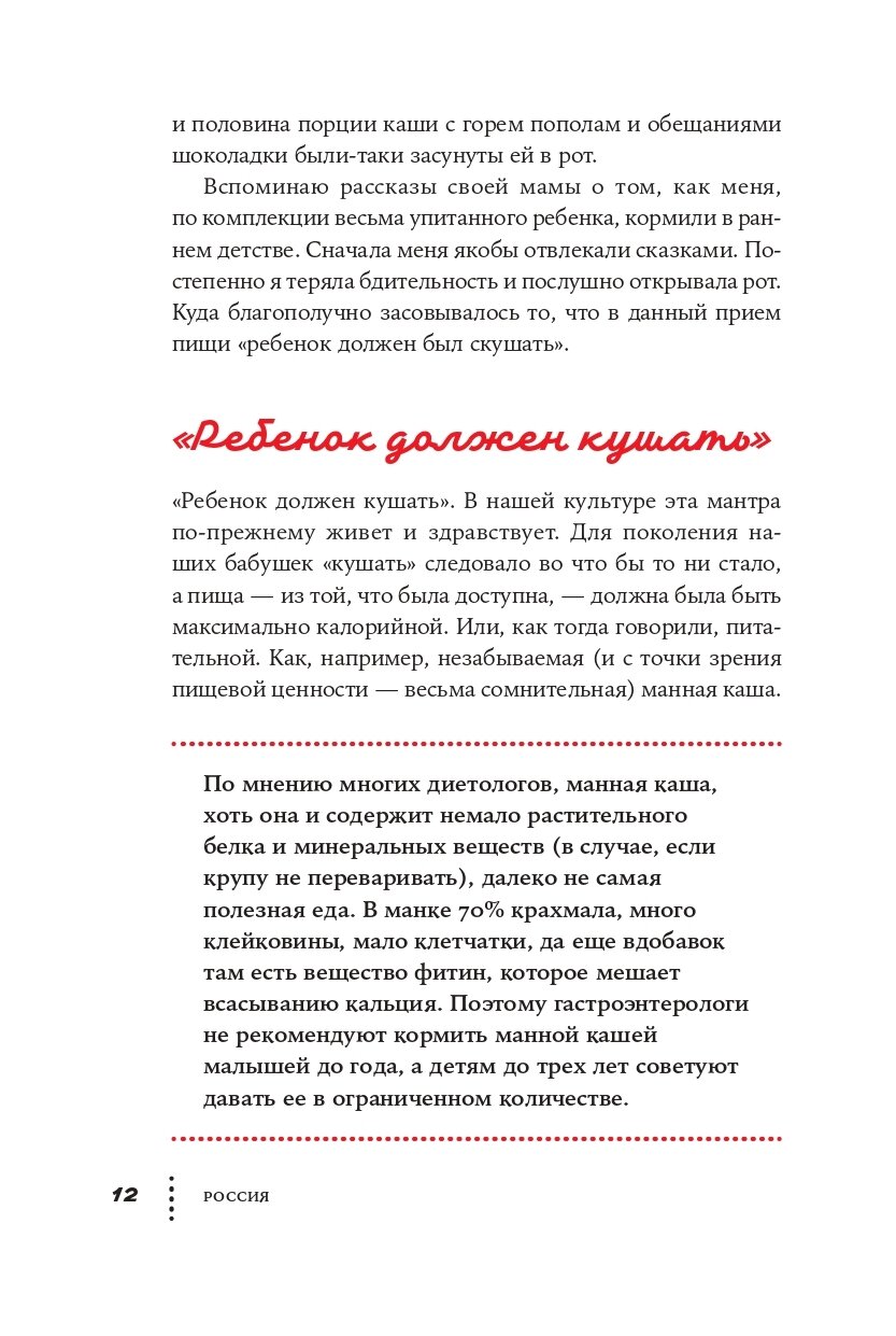 "За маму, за папу", "съешь кашу, получишь конфету" - к каким только присказкам, уловкам и манипуляциям не прибегают родители, чтобы заставить ребенка съесть еще ложечку. Знакомо, не так ли? Чем кормить ребенка и, главное, как его накормить - эти вопросы волнуют многих. Чтобы узнать, как подружить ребенка с едой и какие есть подходы к детскому питанию в России и странах Европы, журналист Светлана Кольчик пообщалась с экспертами в области питания, ведущими российскими и европейскими педиатрами, психологами, диетологами и обычными родителями. Эта книга - результат ее путешествия по пяти странам в поисках ответа на вопрос, как помочь детям и нам самим сформировать более здоровые отношения с едой.