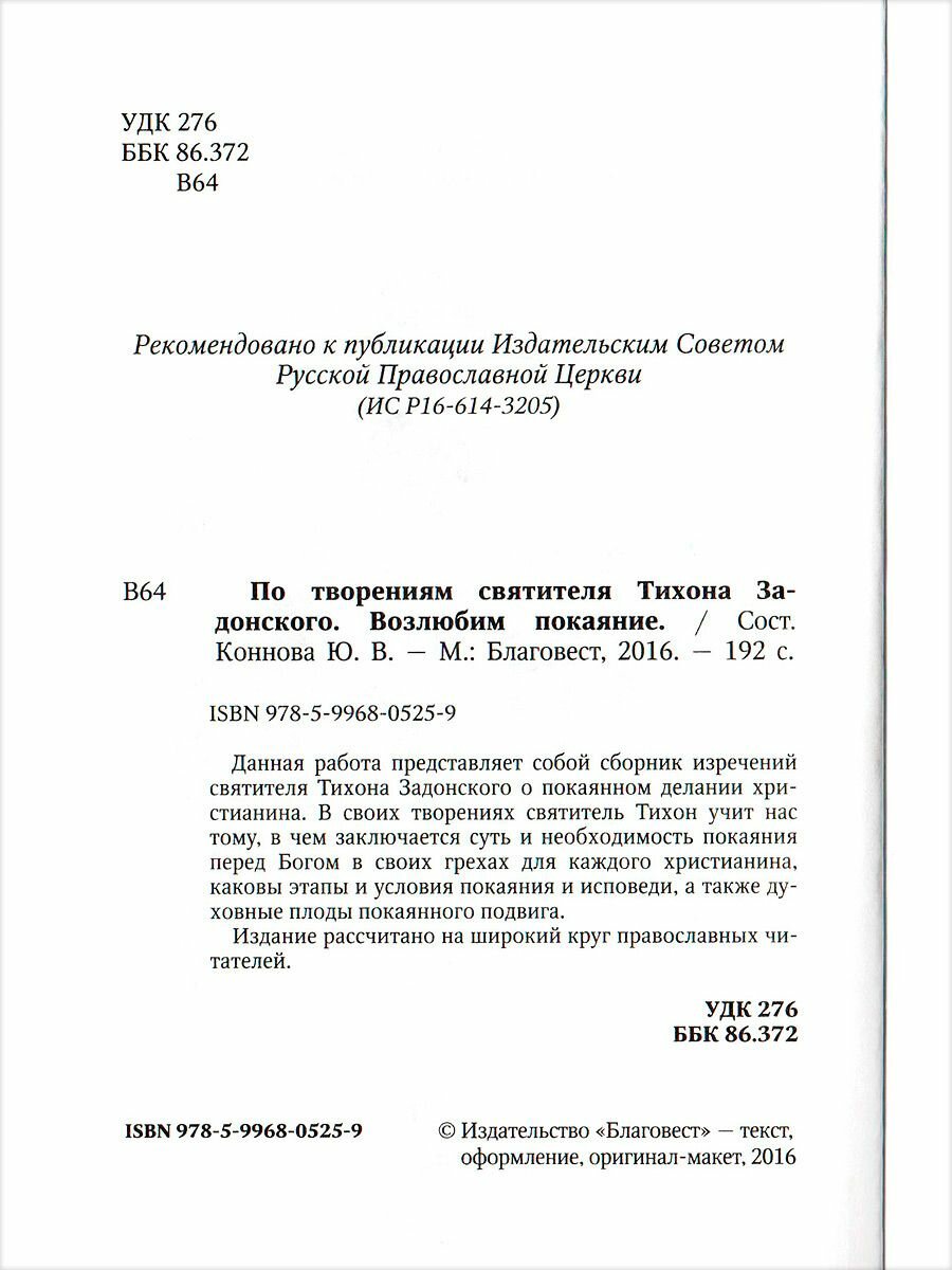 Возлюбим покаяние. По творениям святителя Тихона Задонского (Группа авторов); Благовест, 2016
