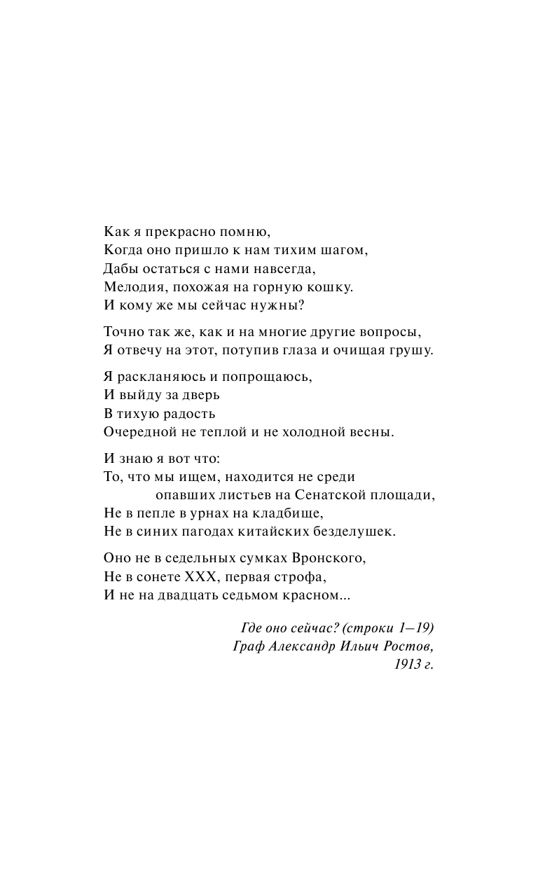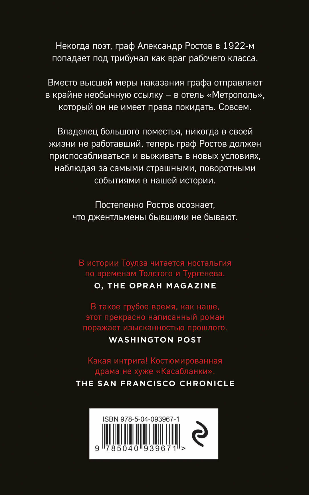 Замечательная книга! Я просто расстроилась,когда до читала её до конца....Судьбу благородного,интеллигентного человека,которому пришлось пол жизни прожить в гостинице" Метрополь", не выходя на улицу под угрозой расстрела. Но и " запертый" в отеле человек смог прожить эти годы не зря,помогая другим,воспитывая чужого ребёнка,даже работая в ресторане... Истинный благородный человек смог не потерять себя,не сломаться перед обстоятельствами. Очень рекомендую! качество печати отличное,Обложка тоже!