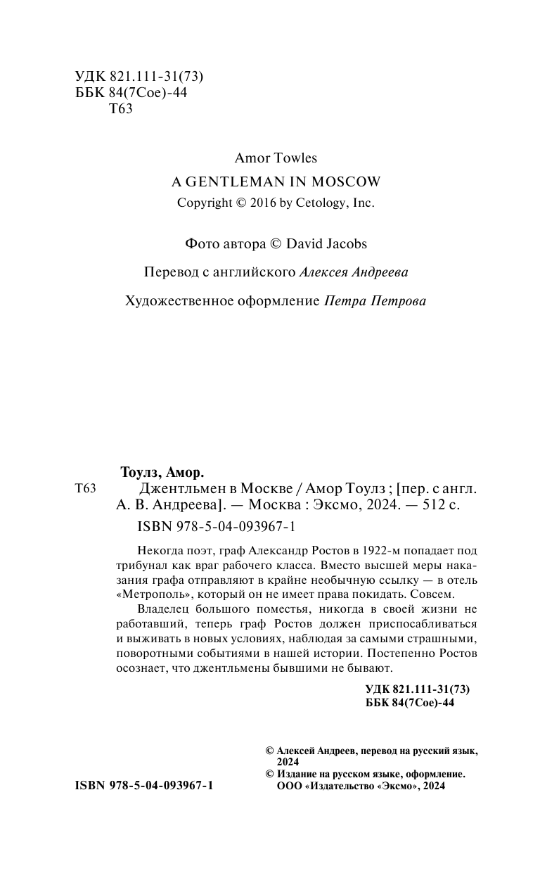 Книга: Джентльмен в Москве (Тоулз Амор, Андреев Алексей Викторович (переводчик)); Эксмо, 2024
