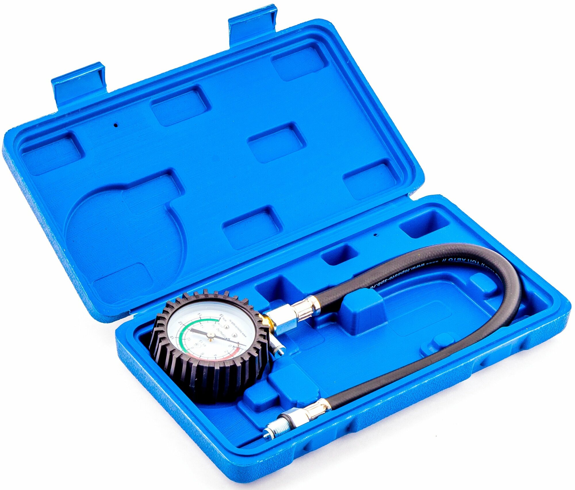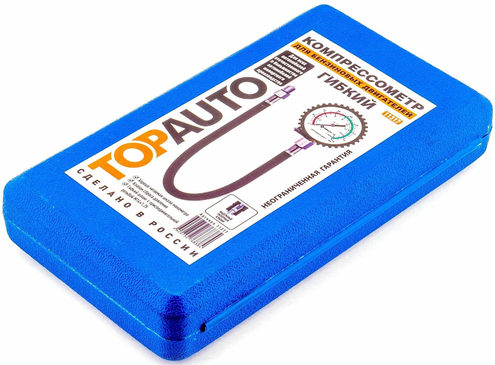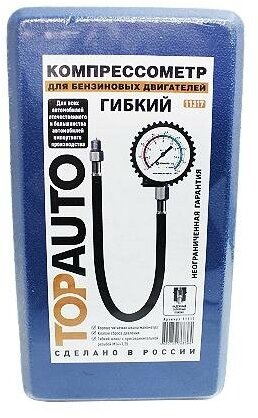 Компрессометр для авто "Топ Авто Гибкий" предназначен для измерения компрессии в автомобильных и мотоциклетных бензиновых ДВС с резьбой свечного отверстия М14х1,25, в который вместо свечи зажигания вкручивается шланг манометра. Благодаря наличию этого гибкого шланга, данный предназначенный для бензиновых двигателей компрессометр обеспечивает возможность проводить измерение компрессии в автомобилях с малым подкапотным пространством; более того - обеспечивает возможность проведения замеров компрессии без демонтажа оборудования, затрудняющего доступ к свечным отверстиям.