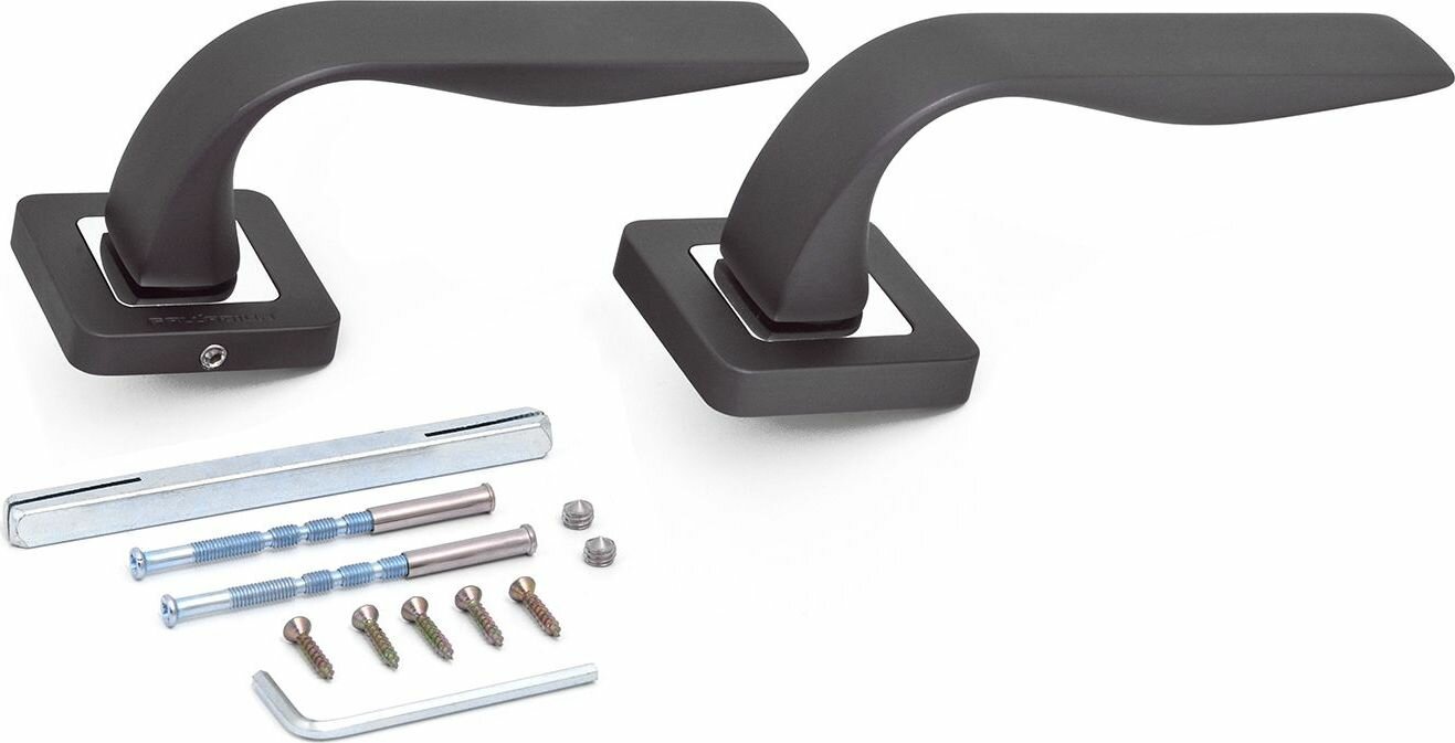 Стильная ручка PALLADIUM Element графитового цвета на квадратной розетке гармонично вольется в современный интерьер, станет броским и запоминающимся акцентом, украсит любую дверь. Модель имеет удобную форму, рычажный механизм с мягким нажимом, гладкую поверхность с закругленными углами и гранями.
