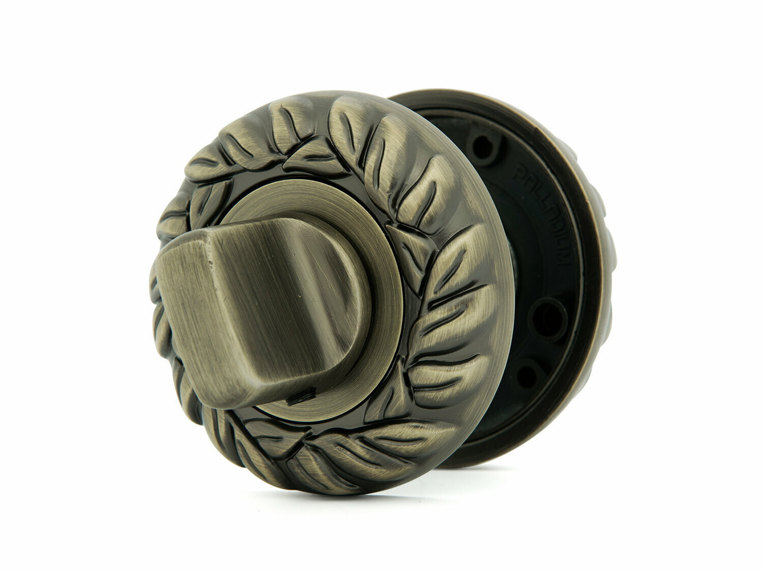 Накладка-фиксатор в классическом стиле для запирания межкомнатной двери изнутри. Сочетается с дверными ручками на круглой розетке из коллекции Palladium Symphony. Типичное применение: ванная, туалет, общий санузел и т. д. Тип: сантехническая накладка-завертка под фиксатор. Стиль «ар-нуво», кант выложен лавровым узором. Некрупная, удобная в обхвате вертушка-барашек. Прорезь для отпирания двери снаружи монетой (если заклинил замок или запершемуся нужна помощь). Ультрастойкое гальваническое покрытие. Два слоя лака: защита от коррозии и царапин. Лабораторные испытания на стойкость к коррозии: >120 ч в камере с соляным туманом (премиум-уровень). В комплекте: накладки сантехнические (2 шт.), квадрат 6x6 мм, шестигранник, шурупы (8 шт.), стяжные винты (2 шт.). Материал: ЦАМ (цинк, алюминий, медь) Цвет: матовая античная бронза Упаковка: коробка