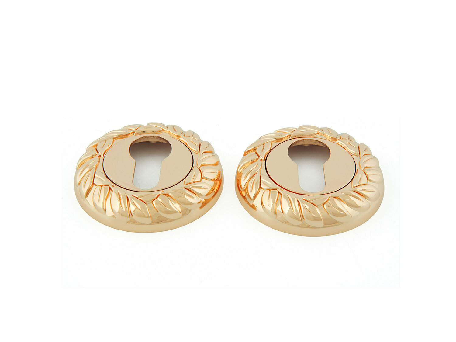 Круглая накладка в классическом стиле для замка с цилиндровым механизмом. По дизайну и размерам сочетается с дверными ручками Palladium из коллекции Symphony. Отлично смотрится на межкомнатных дверях с круглыми филенками и выраженным древесным рисунком. Тип: накладка на скважину под цилиндр. Благородный дизайн с лиственным орнаментом. Долговечное гальваническое покрытие. Слоев покрытия: 6 (финишный лаковый – двойной). Стойкость покрытия к коррозии: >120 ч в камере с соляным туманом. Это выше норм ГОСТа и свидетельствует о премиум-качестве. В комплекте: накладки под цилиндр (2 шт.), шурупы (6 шт.). Материал: ЦАМ (цинк, алюминий, медь) Цвет: золото Упаковка: коробка