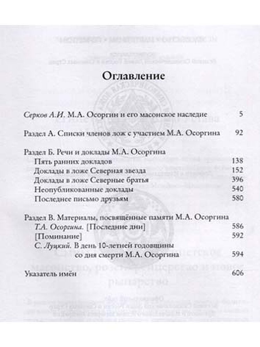 Книга посвящена масонскому наследию Михаила Андреевича Осор-гина (1878-1942), который был одним из идейных руководителей российского масонства союза Великого Востока Франции в эмиграции. Вклад М.А. Осоргина в развитие российского масонства в эмиграции трудно переоценить, он смог воспитать целую плеяду учеников, имена которых остались в истории духовных поисков интеллигенции в XX столетии. Масонское наследие Осоргина было сохранено его вдовой, Татьяной Алексеевной Осоргиной (урожденной Бакуниной) и опубликовано в двух малотиражных книгах, предназначенных лишь для вольных каменщиков. В настоящее издание включены все известные доклады и речи М.А. Осоргина, сохранившиеся в архивах. Помимо очерка о жизни и масонской деятельности М.А. Осоргина в книге также помещены: списки членов лож, в которых состоял М.А. Осоргин, всё сохранившееся масонское наследие М.А. Осоргина и материалы, посвященные памяти писателя.