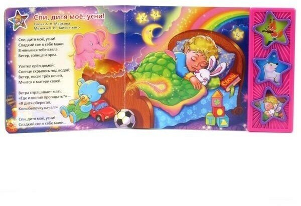 Слушая песни - Спи, моя радость, усни, Колыбельная медведицы, Спи, дитя мое, усни!, ваш малыш научится запоминать слова. Нажимая на кнопки, он будет совершенствовать моторику пальчиков рук. Рассматривая красочные картинки, откроет для себя удивительный мир иллюстрации.
