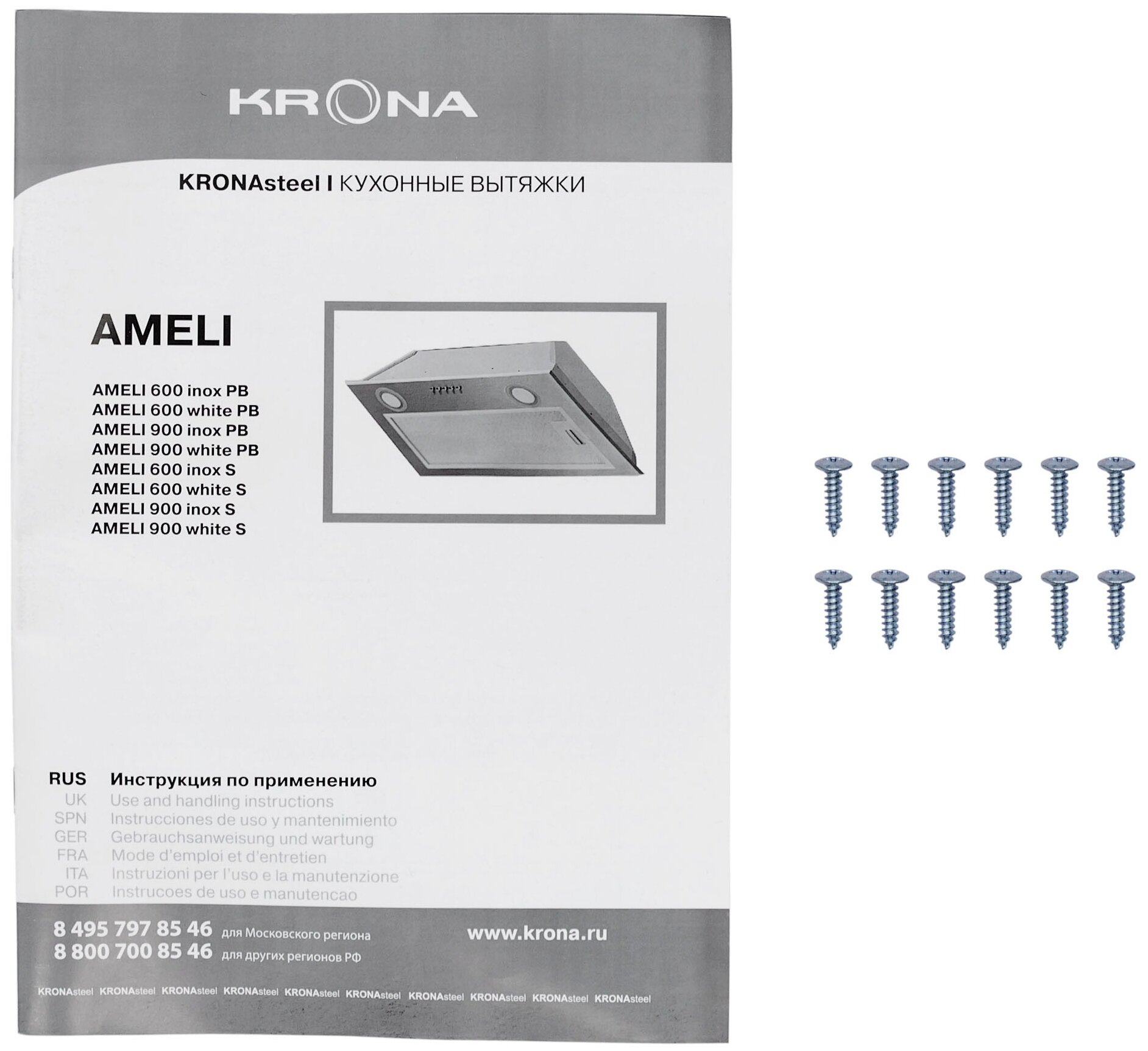 Krona Ameli – компактная полновстраиваемая вытяжка для кухонь площадью до 20 кв.м. Она оборудована антивозвратным клапаном, который препятствует проникновению посторонних запахов, шума, насекомых из вентиляционной шахты.