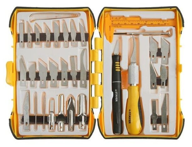 Набор "PROFI" от Stayer - это высококачественный инструмент для работы с деревом. В комплекте вы найдете 33 различных резца, которые помогут вам выполнить самые разнообразные задачи.Лезвия всех резцов изготовлены из закаленной стали, что обеспечивает их прочность и долговечность. Это позволяет использовать инструмент для работы с твердыми породами дерева, а также для выполнения сложных и точных работ.Рукоятки всех резцов выполнены из двухкомпонентного материала - резины и пластика. Это обеспечивает удобство и надежность хвата, а также предотвращает скольжение инструмента из рук. Усиленная рукоятка делает работу с инструментом еще более комфортной и безопасной.В комплекте вы найдете фигурные резцы, долото, пинцет, иглу-шило и отвертку SL2. Это позволит вам выполнять самые разнообразные задачи, от простых до сложных.Набор "PROFI" от Stayer - это отличный выбор для профессионалов и любителей столярного дела.