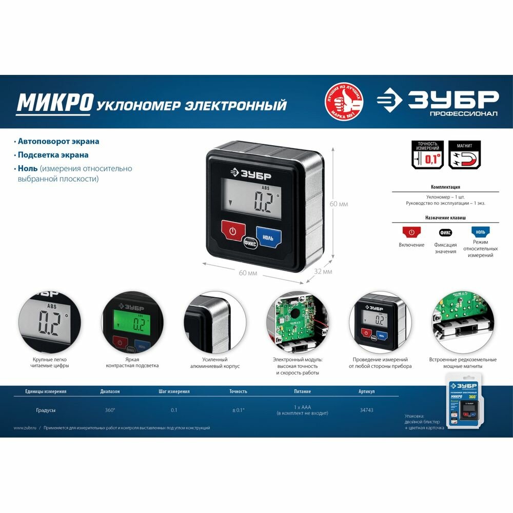Точное измерение уклонов – одна из операций, которая проводится при строительных и отделочных работах. Успешно справиться с процедурой помогает уклонометр ЗУБР 34743_z01. Предназначен он для строителей и отделочников-профессионалов. Гарантирует абсолютную точность замеров. Применяется также при изготовлении окон и дверей, подготовки проемов для их установки, монтаже навесных потолков, конструировании объектов малой архитектуры, устанавливаемых в помещениях, таких как камины, арки, колонны.Уклонометр ЗУБР 34743_z01 выполнен на прецизионном оборудовании, используемом для изготовления высокоточного инструмента. Погрешность измерения ничтожна и составляет 0.1 мм/м. Результаты измерений выводятся на дисплей с крупными цифрами и подсветкой. Уклонометр оснащен функцией автоповорота, повышающей удобство и комфортность его использования. Применение в конструкции магнита позволяет закреплять прибор на металлических поверхностях. Функционирует от 1 элемента питания типа ААА. От механических повреждений во время неожиданных падений инструмент оберегает усиленный алюминиевый корпус.