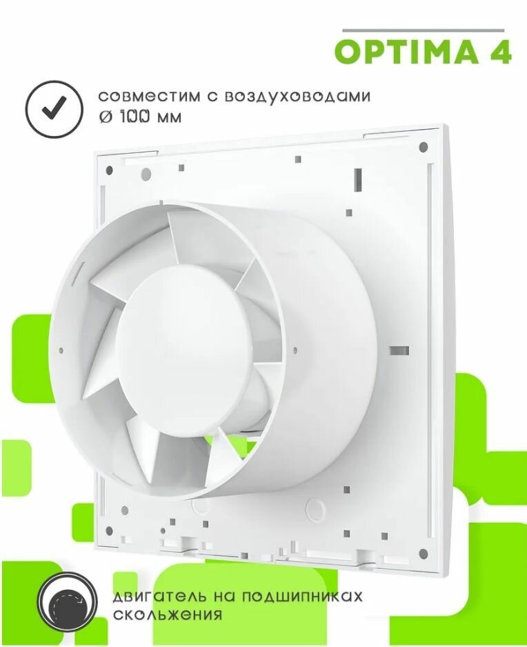 Осевой вентилятор OPTIMA 4 - это оборудование, которое фиксируется в стену и служит для вентиляции воздуха. Изделие монтируется в санузлах, кухнях, душевых и ванных комнатах. Конструкция выполнена из прочного полипропилена. Вентилятор на втулке оснащен защитой двигателя от перегрева. Фиксация прибора происходит при помощи шурупов.