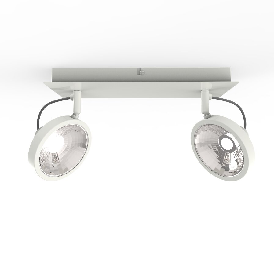 Плоские плафоны белого цвета с прозрачным рассеивателем создают широкий поток света, а за счет поворотного механизма его можно направить в нужную точку. Светильник полностью выполнен из металла и может монтироваться как на стену, так и на потолок. В данной модели могут использоваться светодиодные или галогенные лампы с подходящим цоколем. Весь необходимый крепеж входит в комплект.