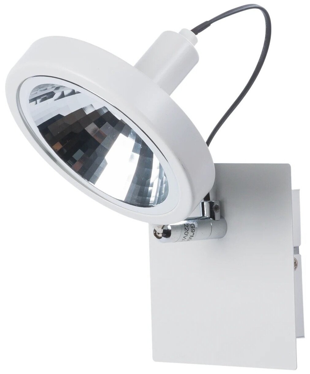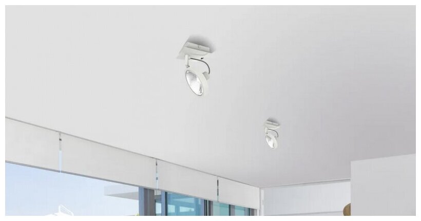 Плоский плафон белого цвета с прозрачным рассеивателем создает широкий поток света, а за счет поворотного механизма можно направить его в нужную точку. Светильник полностью выполнен из металла и может монтироваться как на стену, так и на потолок. В данной модели могут использоваться светодиодные или галогенные лампы с подходящим цоколем. Весь необходимый крепеж входит в комплект.