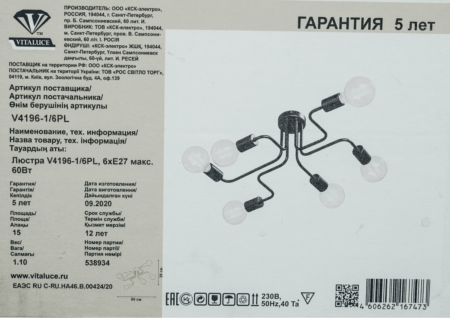 | Тип продукта | Люстра потолочная |