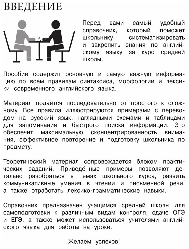 Справочник содержит важные материалы, которые помогут даже в сжатые сроки подготовиться к урокам, ОГЭ и ЕГЭ по английскому языку. Теория изложена в наглядной форме и дополняется блоком практических заданий c ответами для комплексного закрепления знаний.