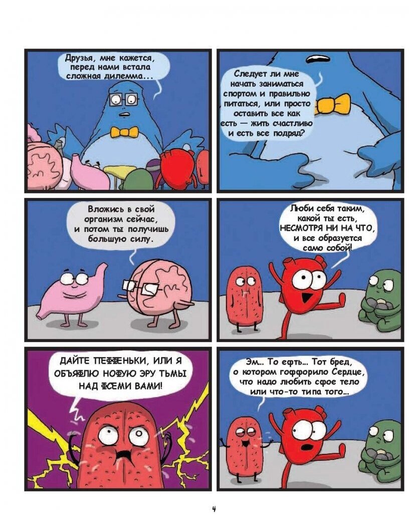 Комиксы о работе, сапогах с Wi-Fi, рискованных приключениях, несправедливости жизни и пирогах. А еще о том, как мы незначительны по сравнению со звездами, и о том, как воплощать мечты с помощью чашки кофе.Во второй части "Тайного мира внутренних органов" — Сердце и Мозг, уже знакомые читателю закадычные друзья с противоположными взглядами на мир, а также их соседи: Кишечник, Желудок, Зубик, Язык, Желчный Пузырь (помните интернет-мем "Я сделяль"? Он пришел отсюда!) и многие-многие другие.Шепелявый Язык любит сладенькое, мизантроп Кишечник раздражается от попыток расшевелить его, а самоуверенный Желудок всегда переоценивает свои силы. У каждого из персонажей Ника Селака – свой характер, свои обязанности и, конечно, свои слабости. Поневоле удивляешься: как эти ребята вообще могут уживаться в одном теле?
