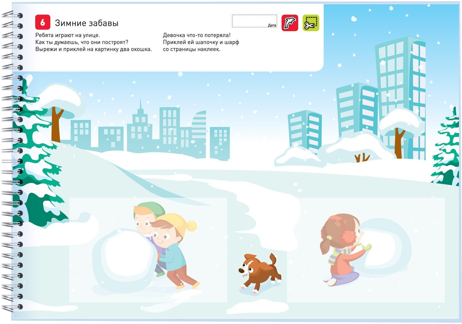 Задания интересные, предлагается наклеить нужную картинку на нужное место или вырезать и приклеить. Получится страница, на которой есть окошки (т.е. появляется динамика в картинках и сюжет, по которому можно построить диалог с ребенком).