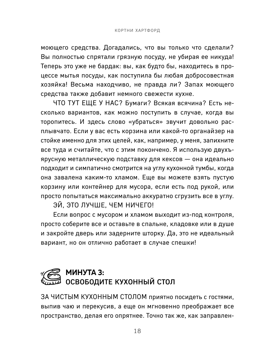 Очень понравилась глава об ароматах в доме - первый раз вижу, чтобы в книге об уборке об этом была целая глава. Множество рецептов чистящих средств из подручных материалов порадуют нелюбительниц избытка бытовой химии в доме. А ещё вы узнаете, как много всего могут посудомоечная и стиральная машины. И удивитесь, что лак для ногтей можно использовать в наведении порядка. Ну и автор напомнит вам о том, как важно заправлять кровать, смиритесь.