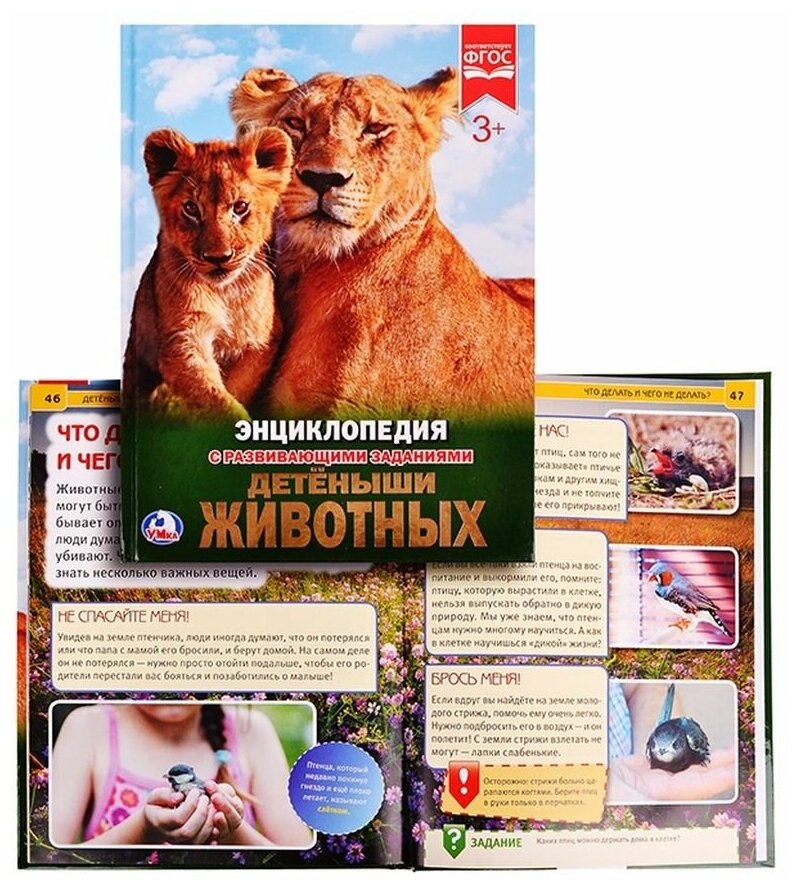 Есть несколько энциклопедий из этой серии, очень нравится качество исполнения книги: твёрдая обложка, плотные листы, отличное качество печати. Книга с детёнышами самая милая, очень нравится пересматривать фотографии. Текст отлично напечатан, подходит для самостоятельного чтения детям. Есть задания по изложенному материалу.