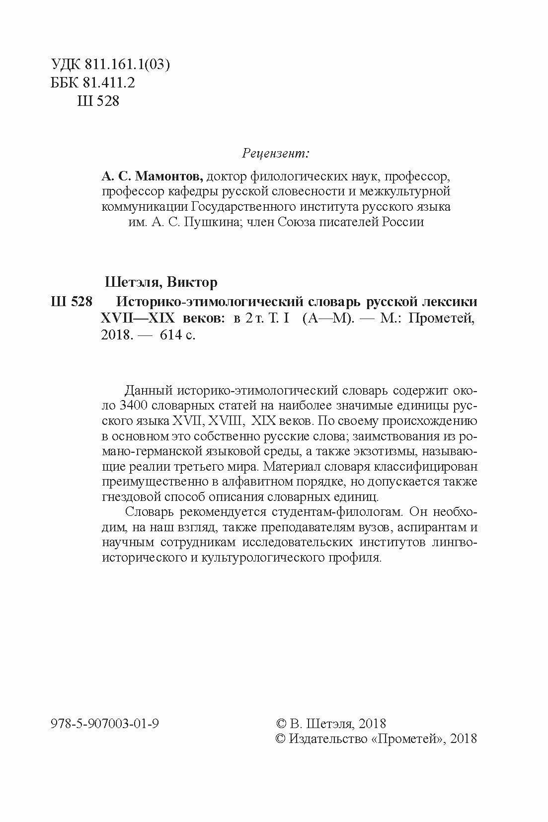 Историко-этимологический словарь русской лексики XVII—XIX веков. Том 1. А-М (Шетэля Виктор Мечиславович); Прометей, 2018