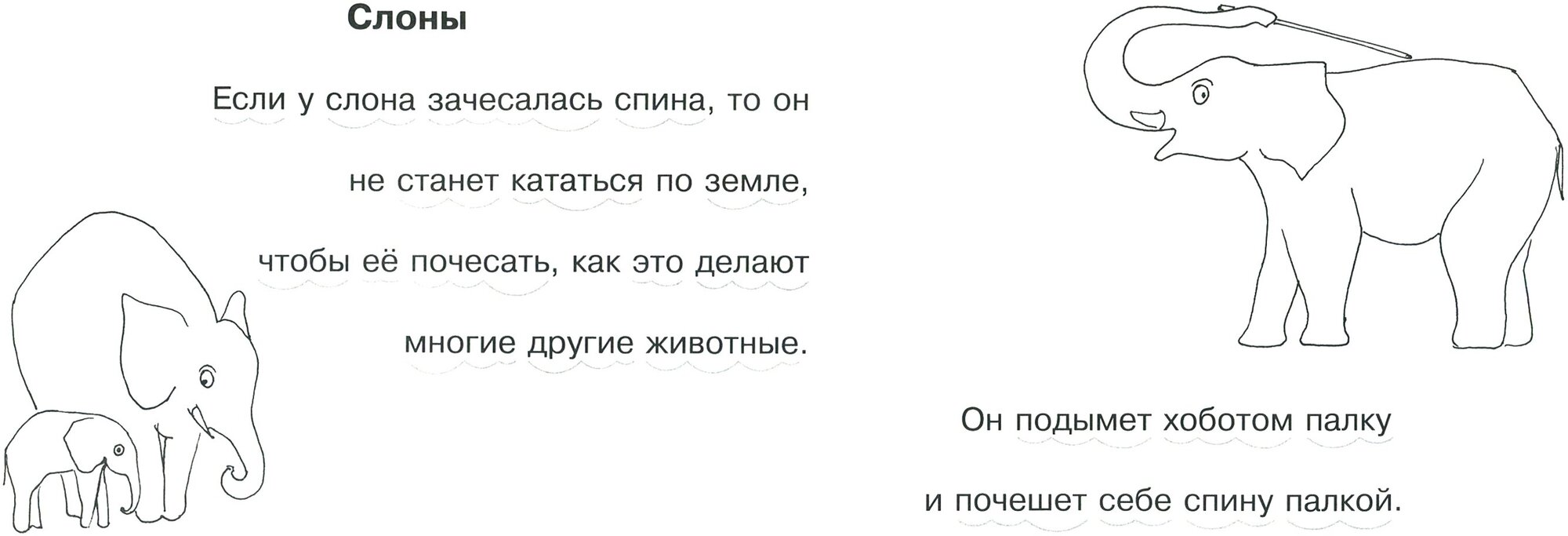 Для детей, которые только осваивают чтение, мы разбили слова на слоги (удобные для чтения), но показали это дугами, а не с помощью дефисов, чтобы не нарушать графический образ слова.После того как ребёнок прочитает текст, попросите его пересказать прочитанное. Для него это может быть сложно по нескольким причинам: он слишком сосредотачивается на процессе чтения и плохо представляет то, о чём читает; не может вспомнить необходимые слова, а подобрать синонимы ему не позволяет.