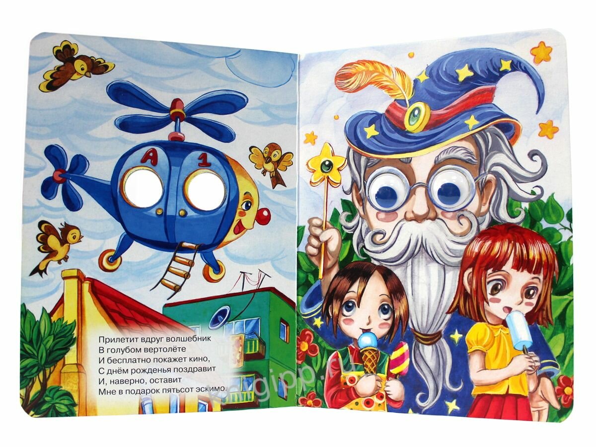 Картонные страницы. Цветные иллюстрации. На каждой странице у героя на месте глаз - прорези, на последней странице - пластиковые глазки с подвижными зрачками. Ребенок переворачивает страницы, и у героя "появляются" глазки.