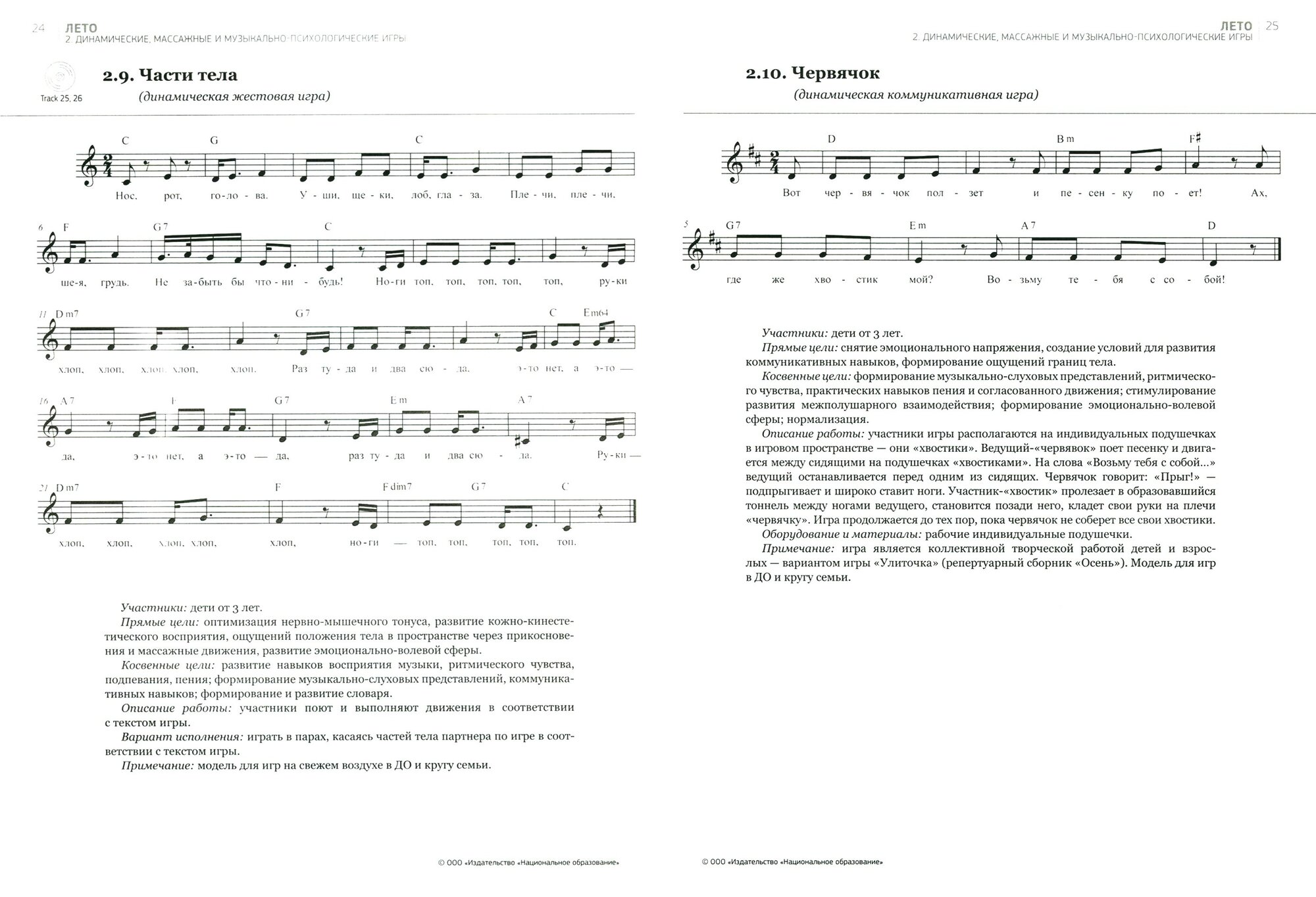 Репертуар сборника "Лето" охватывает все привычные формы работы педагога на музыкальном занятии: пение, движение, игру на музыкальных инструментах, театрализованную деятельность - и включает: