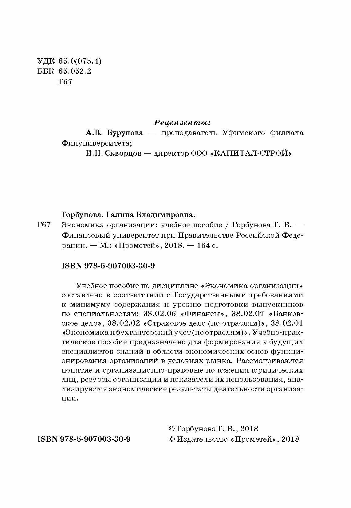 Экономика организации. Учебное пособие (Горбунова Галина Владимировна); Прометей, 2018